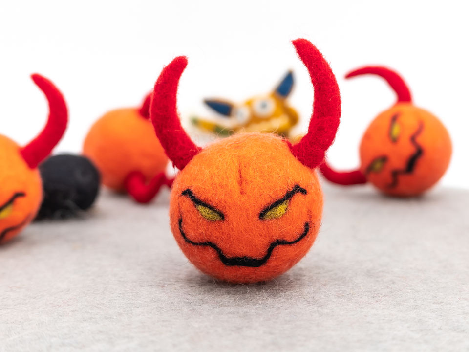 9cm Handmade Wool Felt Spooky Orange Devil with Red Horns Ornament Mischievous Halloween Face Party Decorations