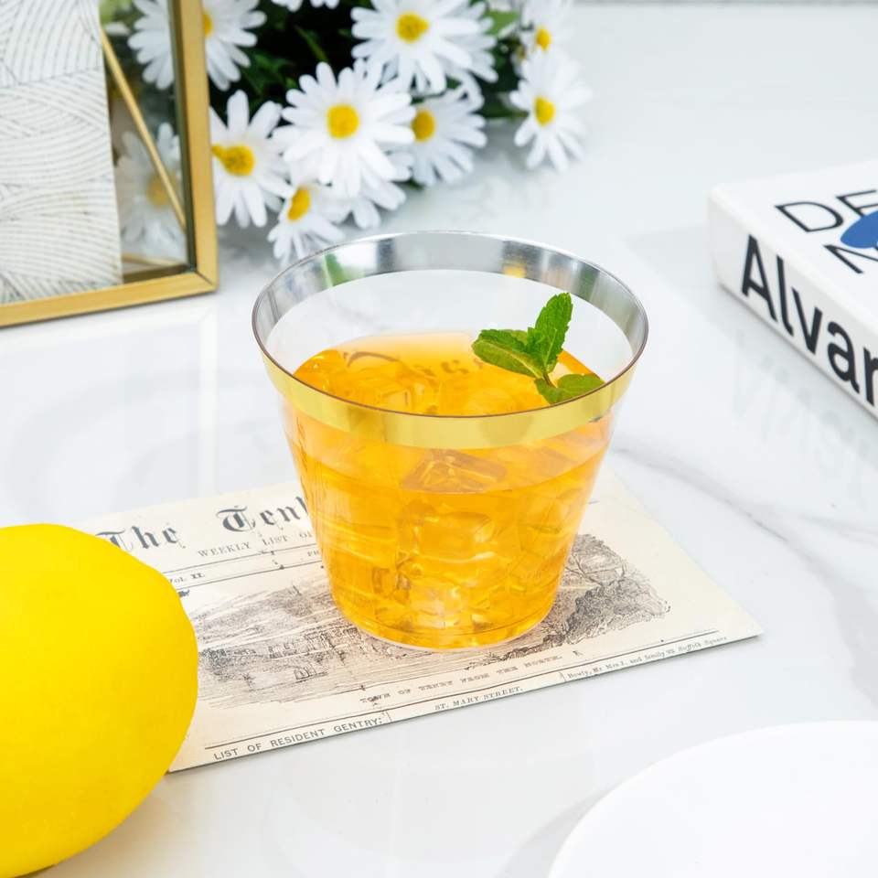 9oz Disposable Plastic Gold Glitter Cups Elegant Wedding Party Tea Cups Saucers for Christmas Fancy Disposable Cups for Special