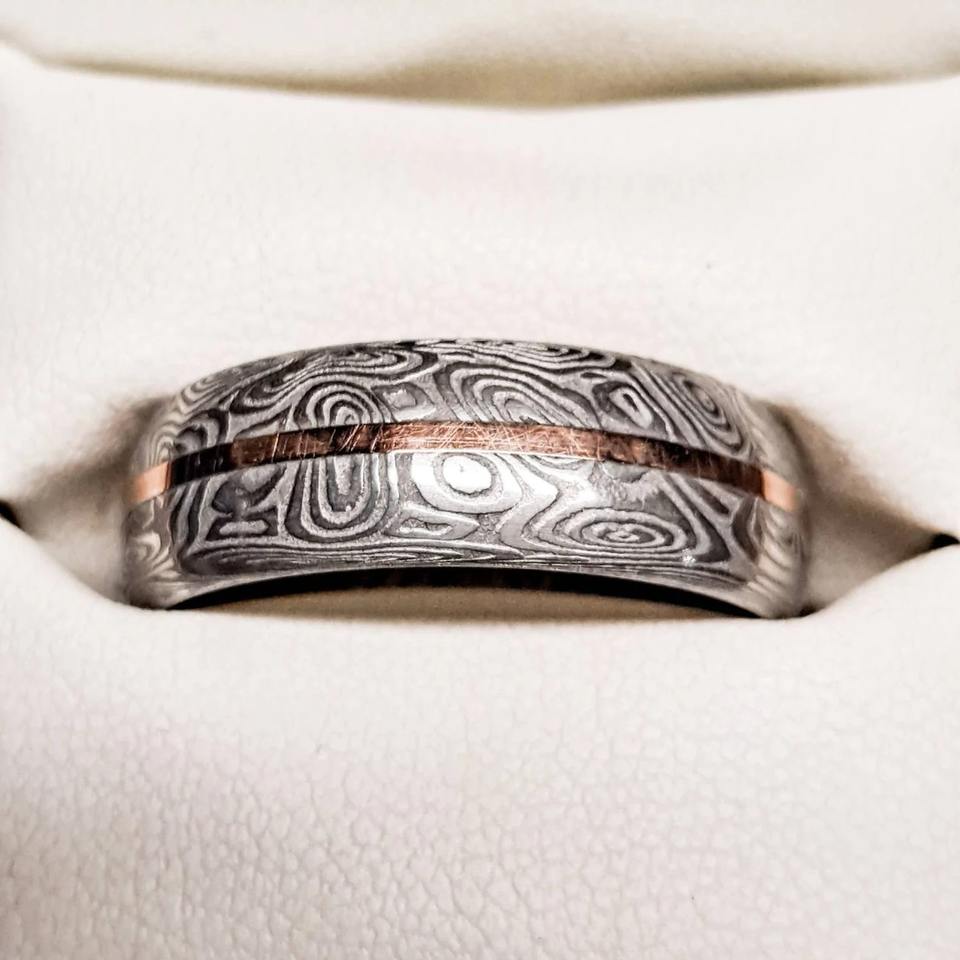 A Stainless Damascus Steel Ring, Hand Forged With An Inlay Of Rose Gold Gift For Your Engagement And Your Weeding.