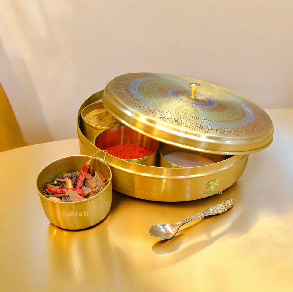 A beautifully textured golden and pastel green spice box, partially open to reveal vibrant