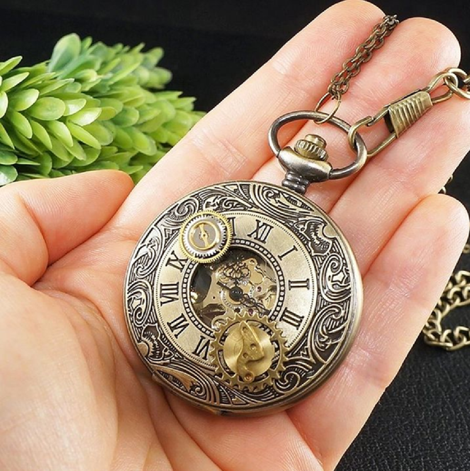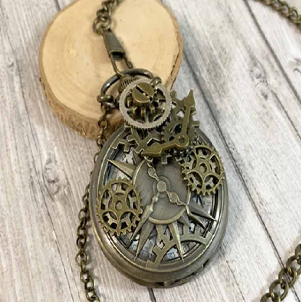 A captivating steampunk brass pocket watch with intricate bronze gears and a compass-style dial on rustic wood, a true classic,