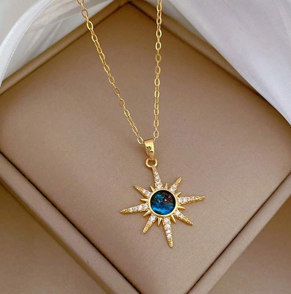 : A crescent moon and star pendant in gold with a crystal border, elegant, minimal, and symbolic of faith or celestial beauty.