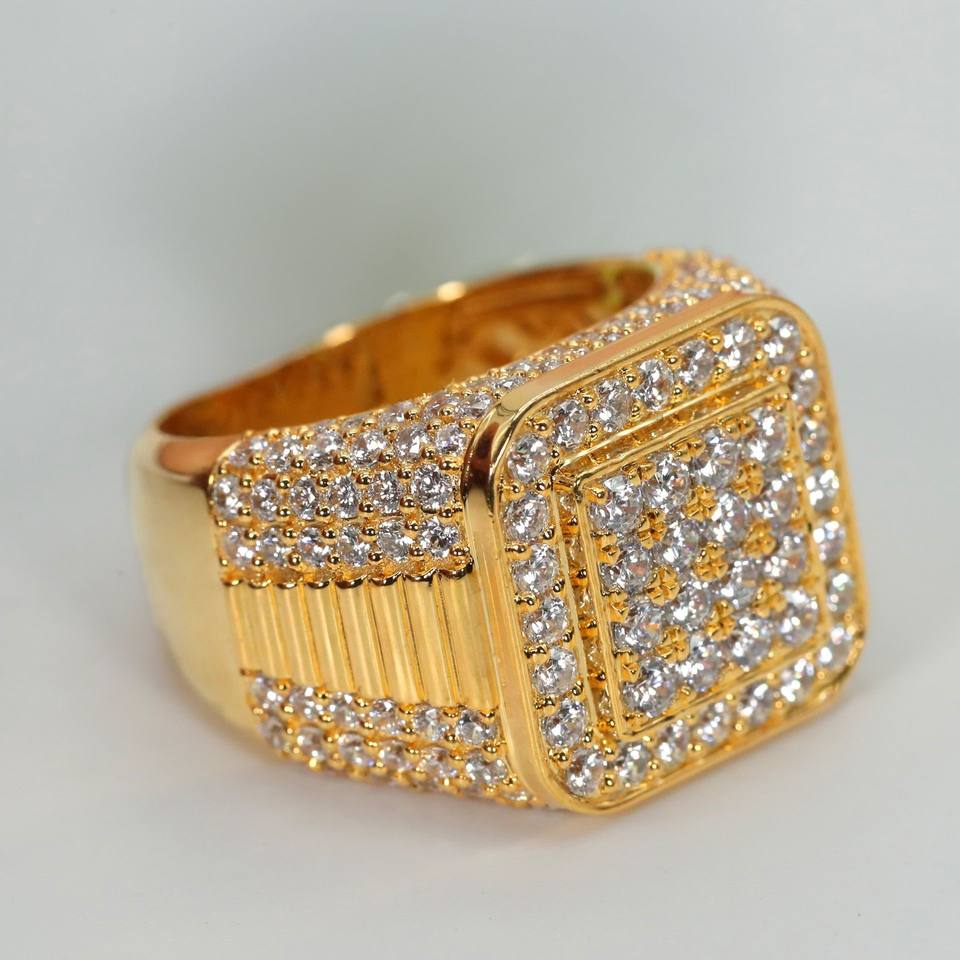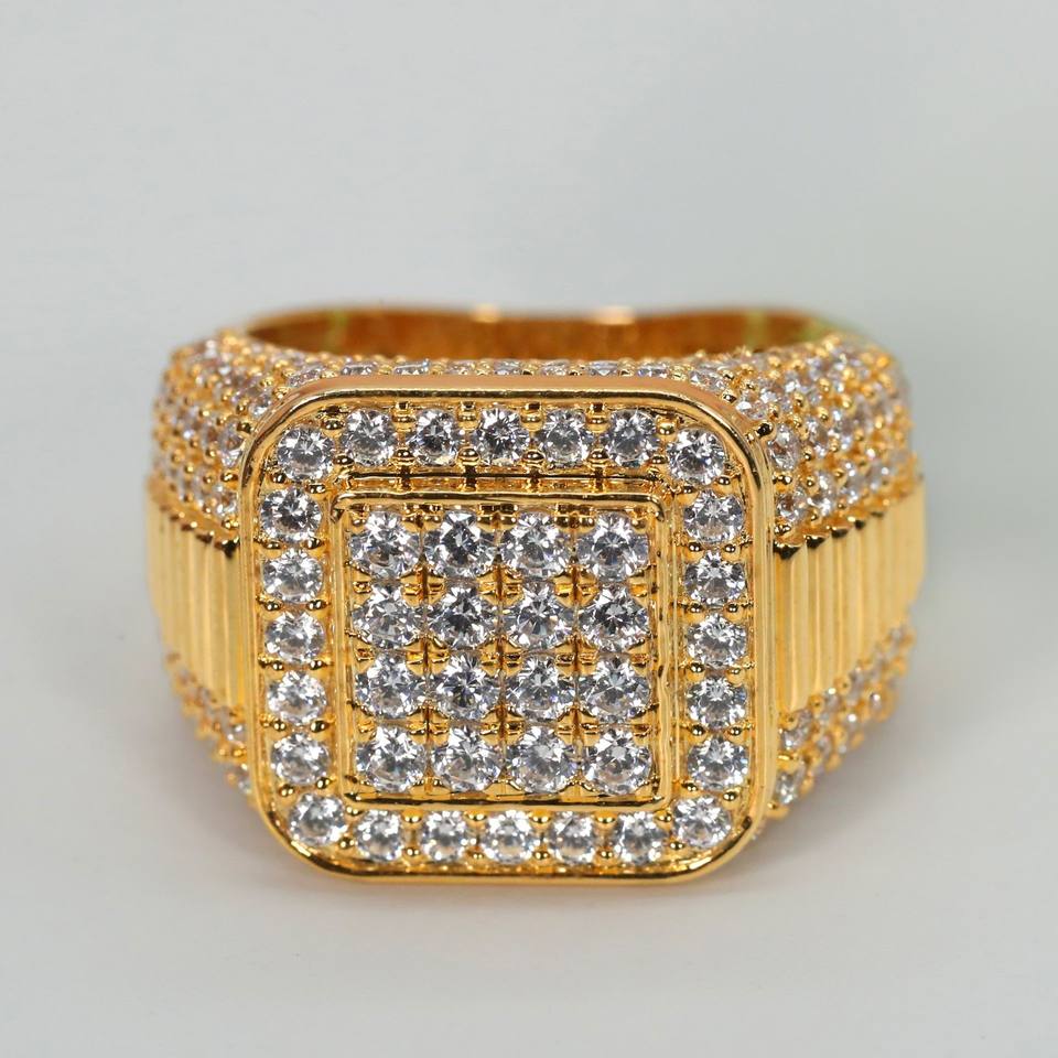 A dazzling mens hip hop diamond ring in 14 kt yellow gold, radiating brilliance with VVS clarity to enhance their style