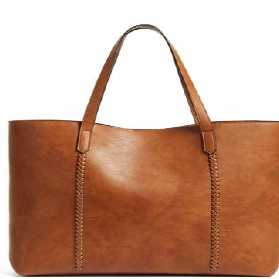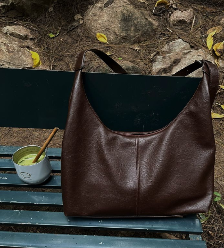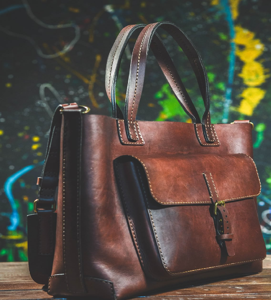 A high-quality rustic brown leather tote featuring a large front pocket and a sturdy top handle great for professional aesthetic