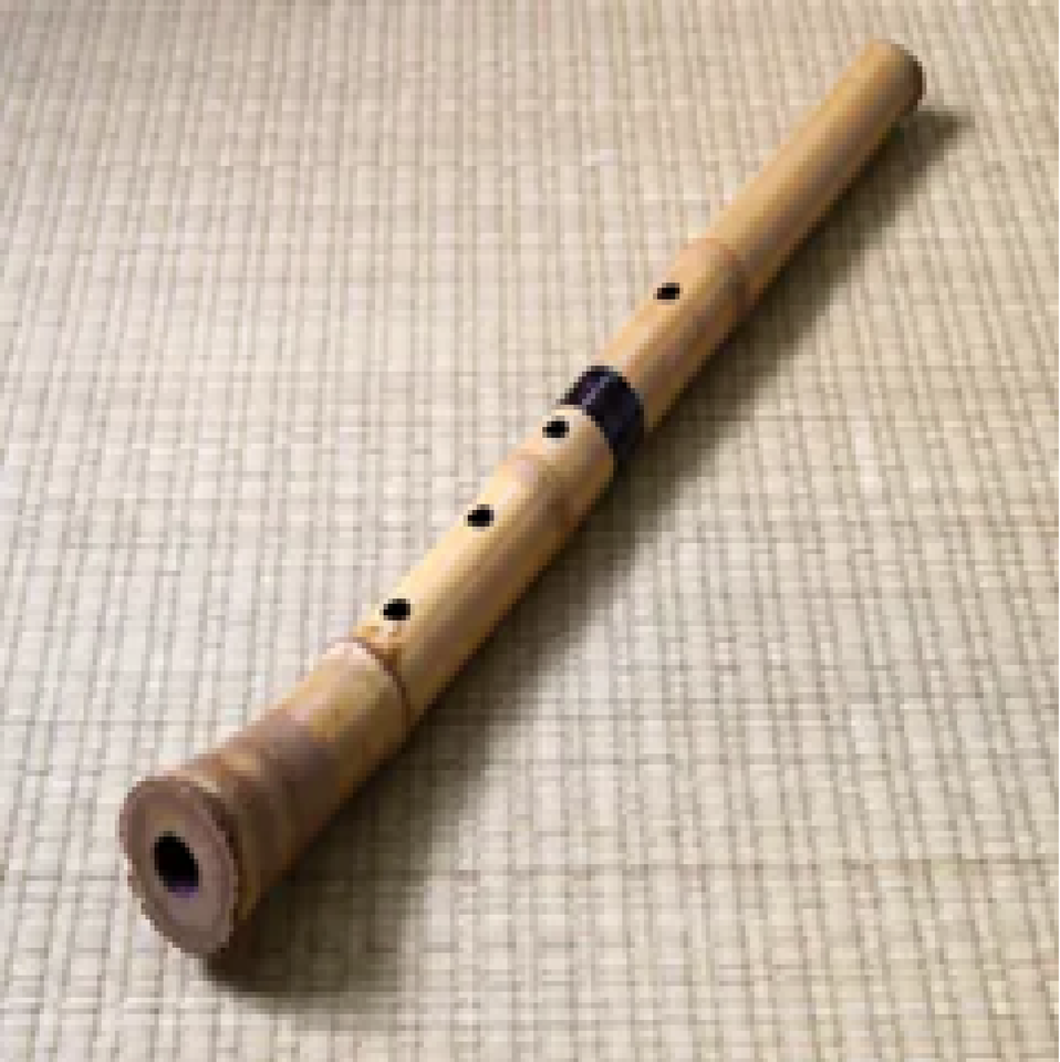 A long, light-colored bamboo flute decorated with traditional artwork, including figures, at wholesale prices.