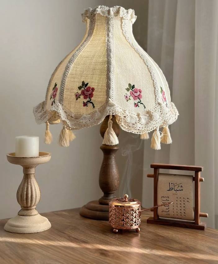 A statement piece! Modern glass lamp with a bold leopard spot pattern and a simple linen conical shade.
