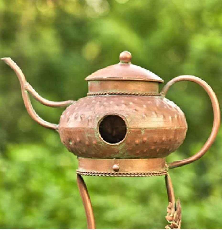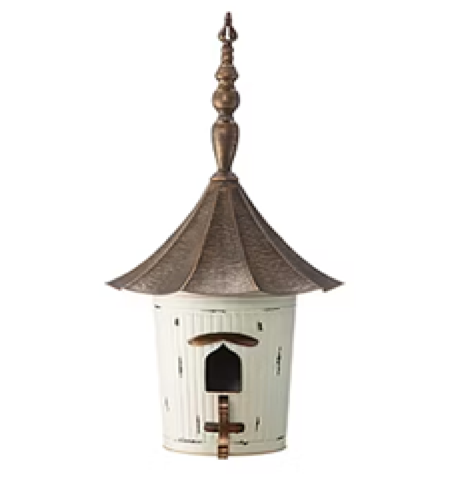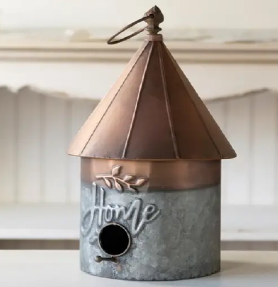 A stylish metal birdhouse featuring a galvanized base and a copper-toned conical roof with "Home" embossed on front at wholesale