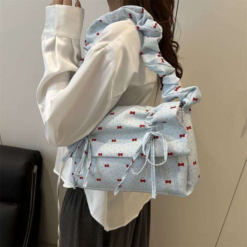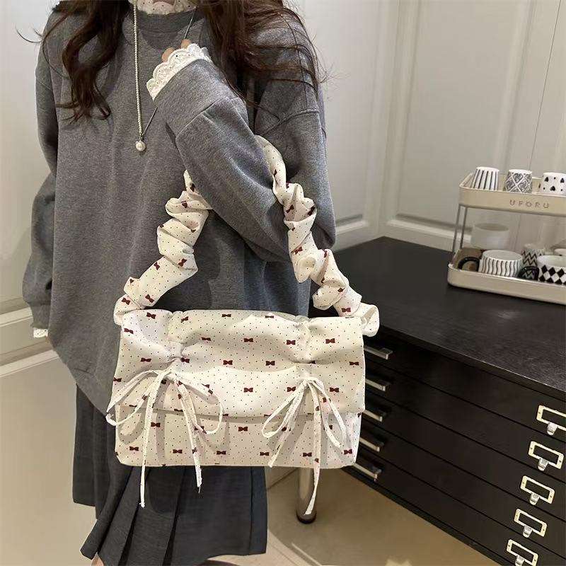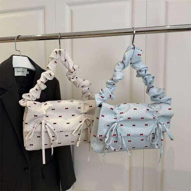 A sweet women's handbag with polka dots and bows, pleated design and soft tones