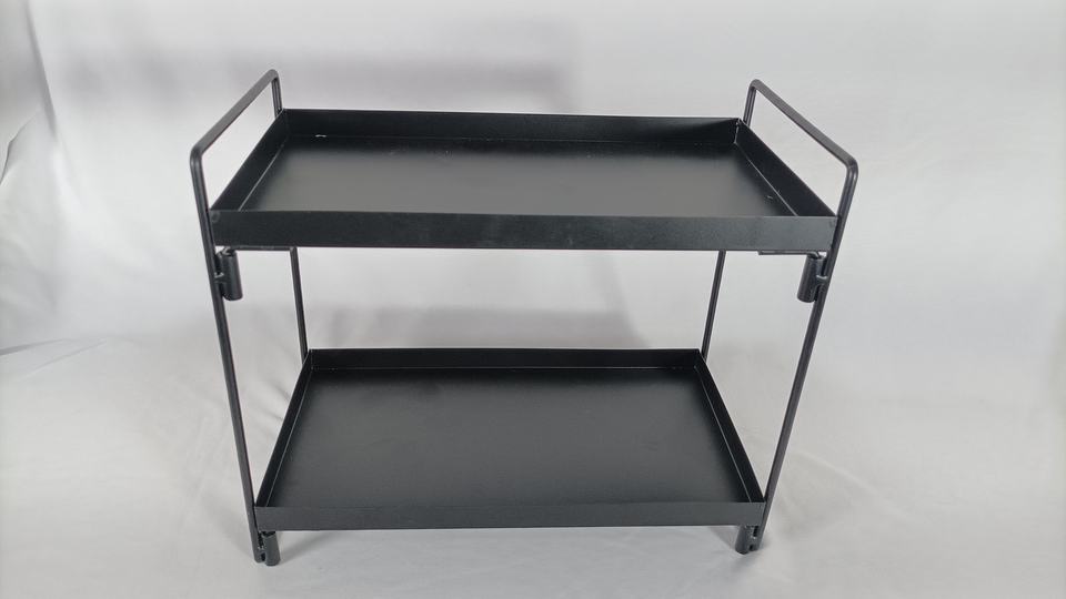A two-tiered black metal storage rack suitable for organizing items in various spaces like kitchens bathrooms or offices