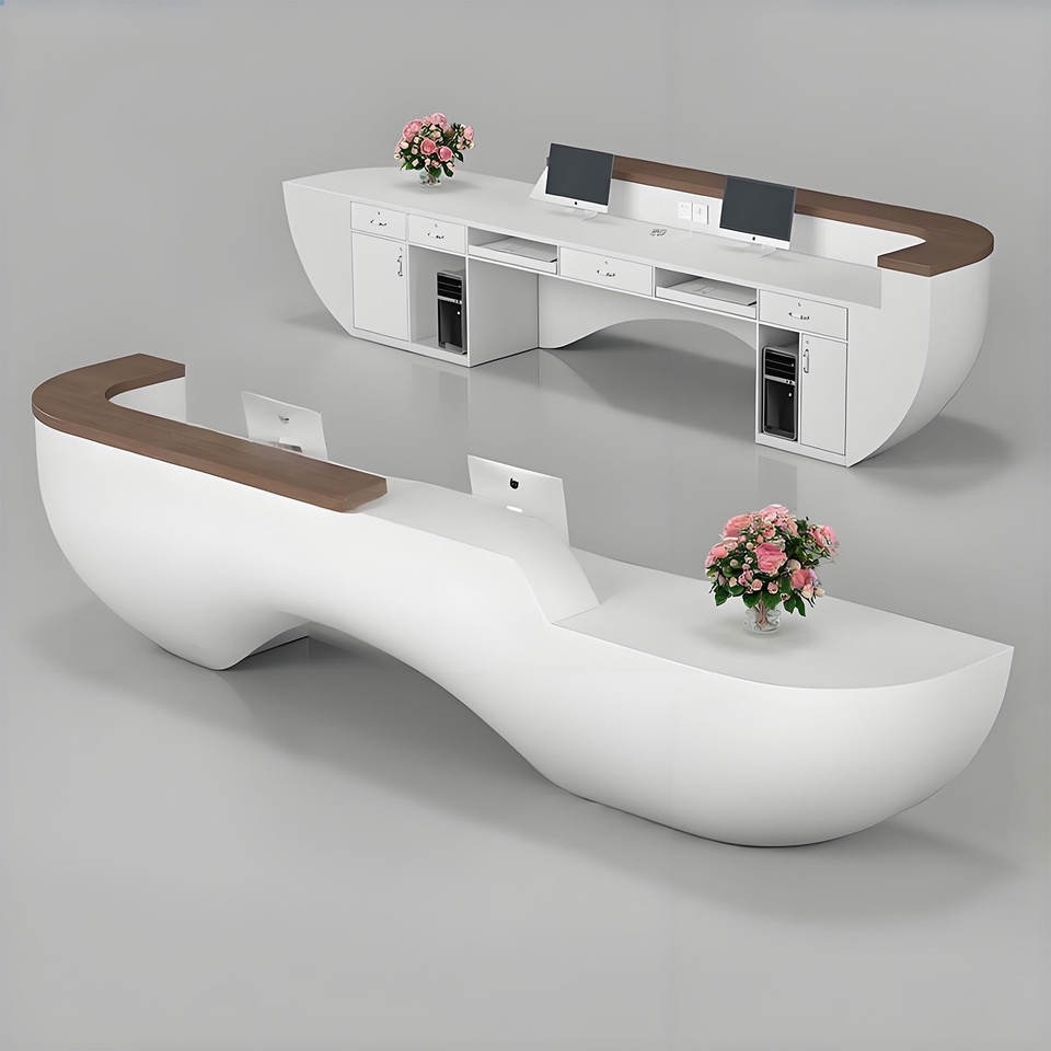 A4 Light Pink Curved Modern Reception Desk Fiberglass Wood Customizable Color Commercial Use School Office Salon Bar Bank