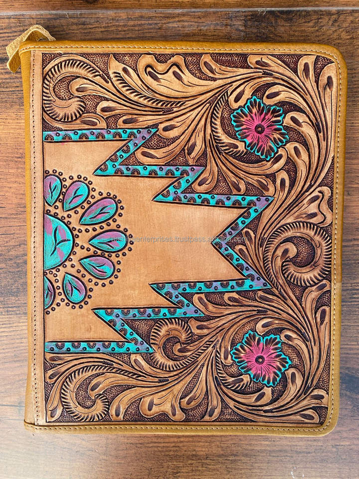 A4 Multifunctional Zipper Hand Leather Document File Holder Ring Binder Custom Office Genuine Leather Floral Portfolio Organizer