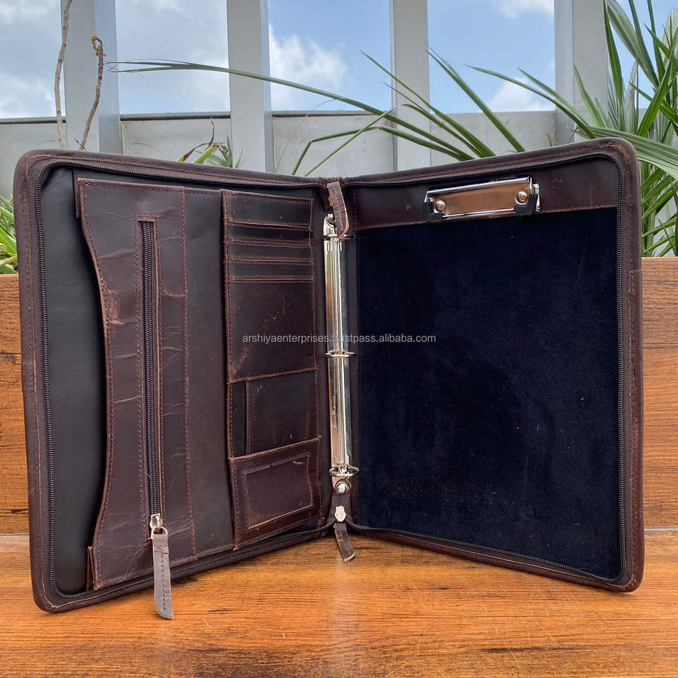 A4 Size Genuine Hand Tooled Leather Binder Notebook Pocket File Business Organizer Durable Zipper Folder for Document Storage