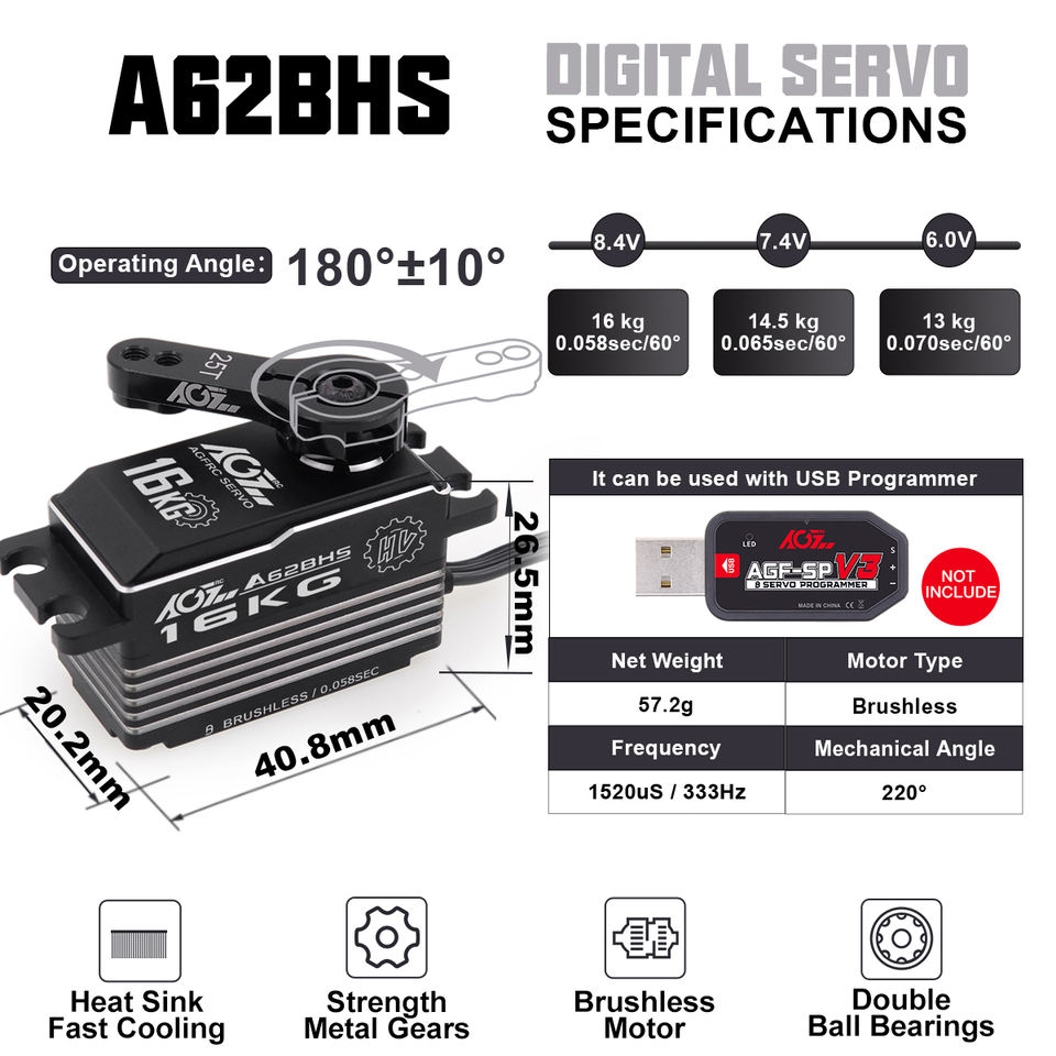 A62BHS Steel Gears 16KG 0.058s Fast 8.4V HV 180 Degree Digital Programmable Low Profile Brushless RC Drift Car Accessories