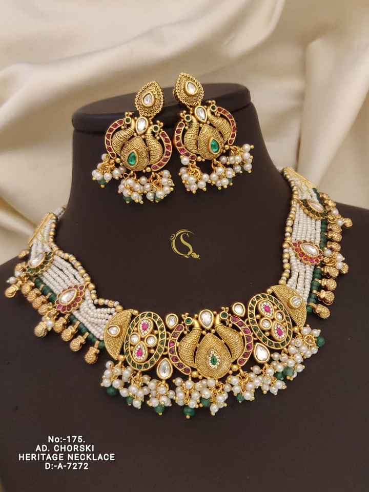 AD Chorski Heritage Necklace Set with Kundan Stones Green Beads & Pearl Drops Bridal Temple Jewelry Design
