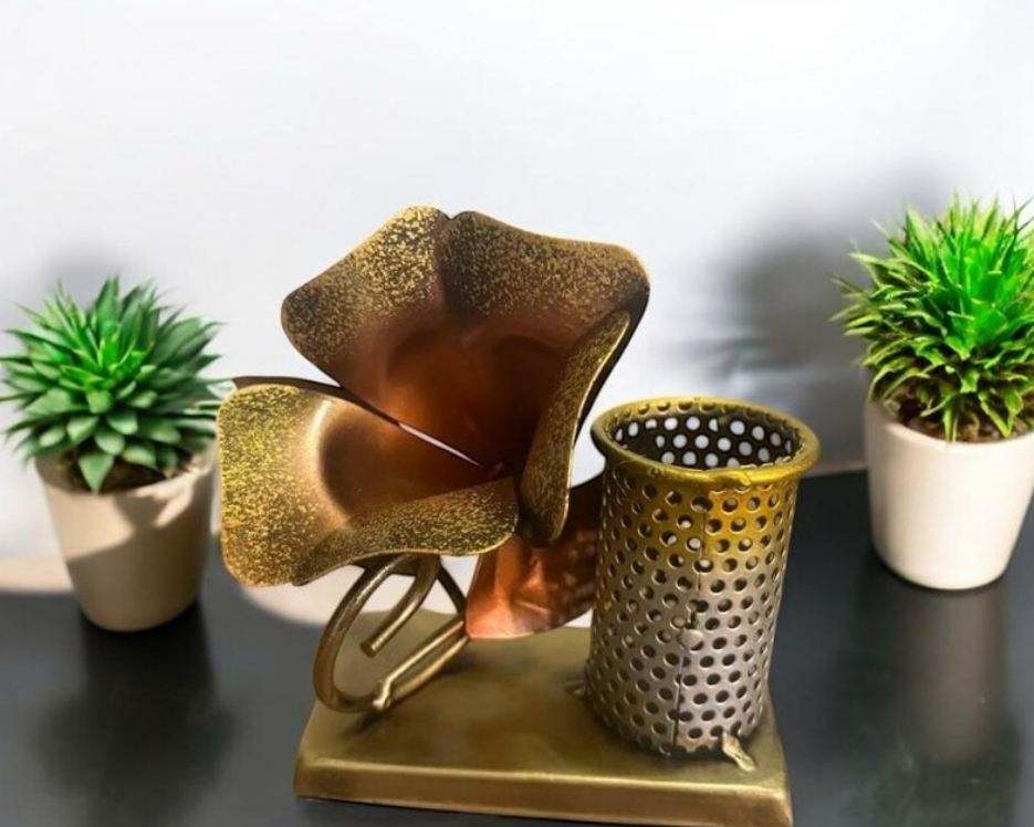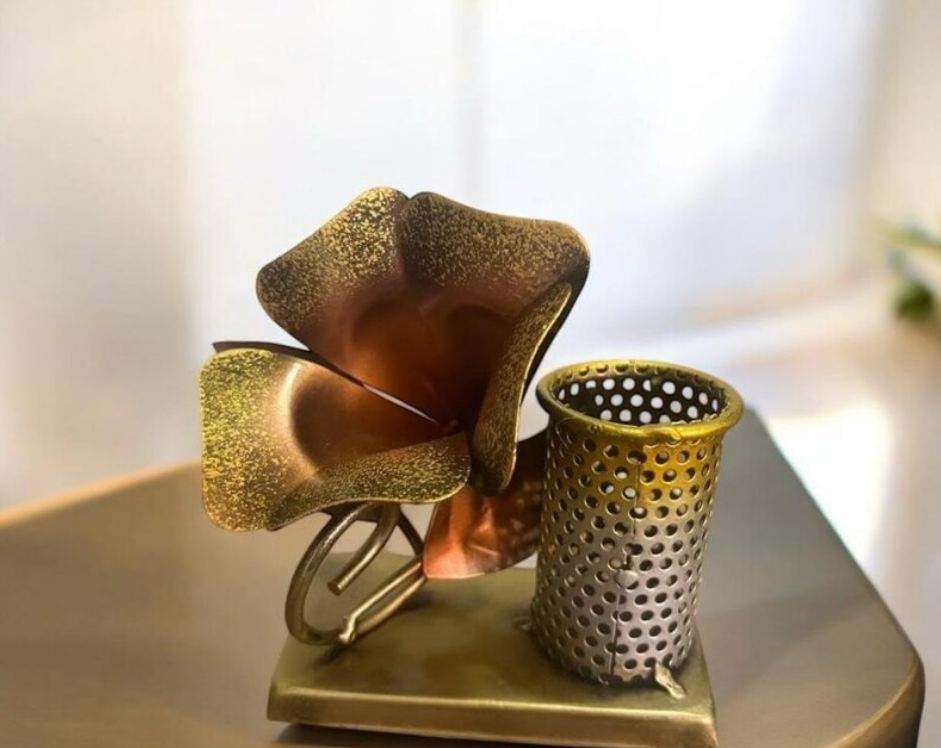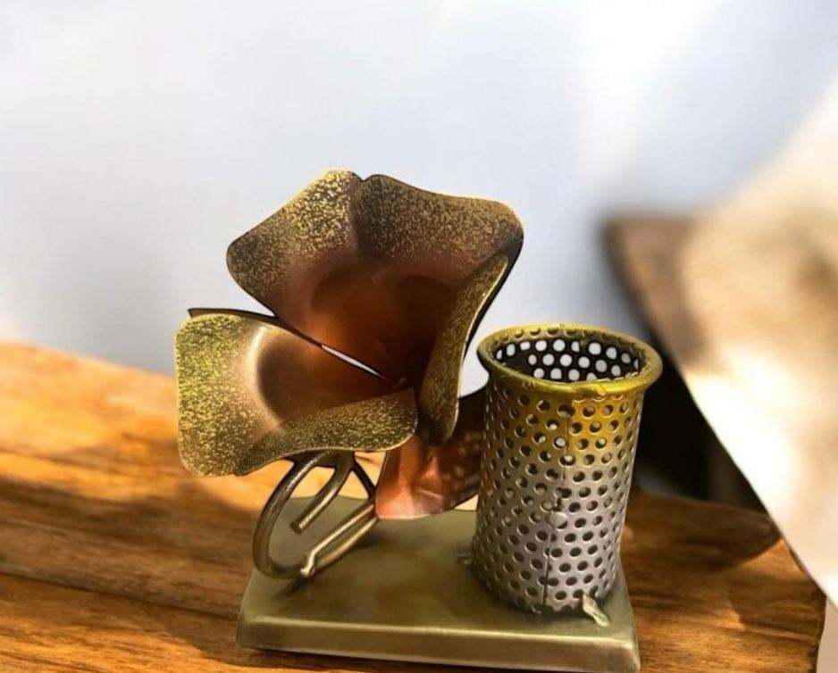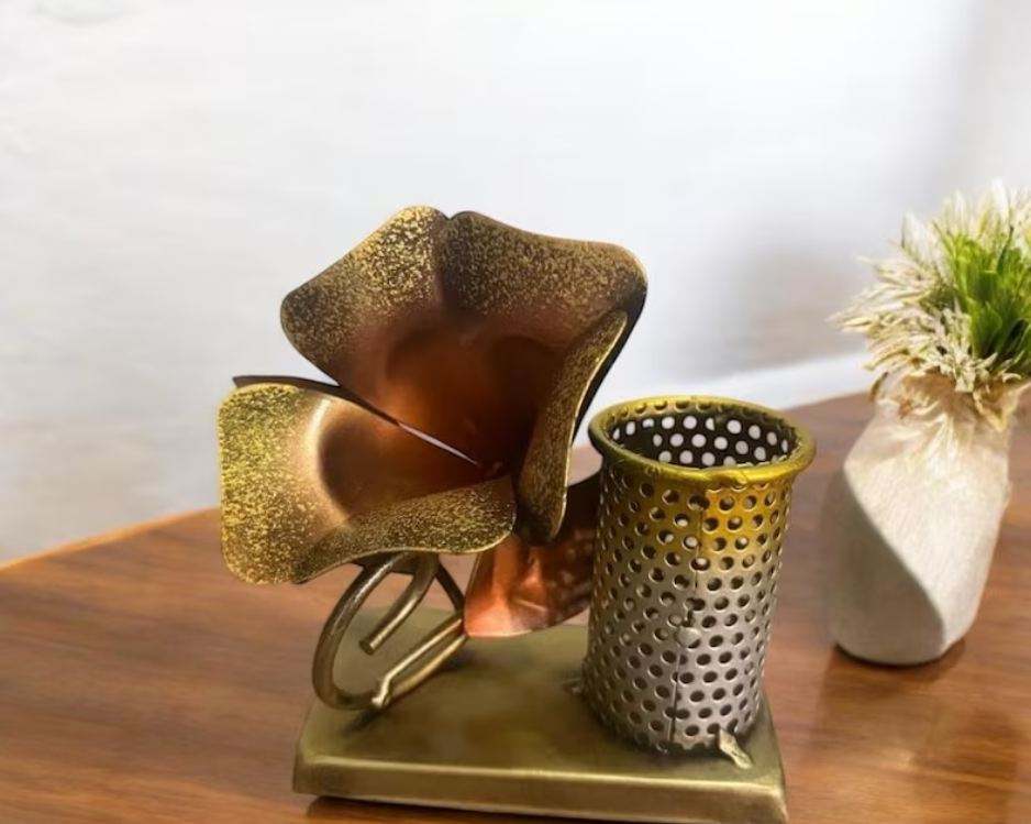 AK Brass Large Flower Metal Pen Stand in Brass Antique Finished High Quality Holder For Study Room Decor / Library Decor