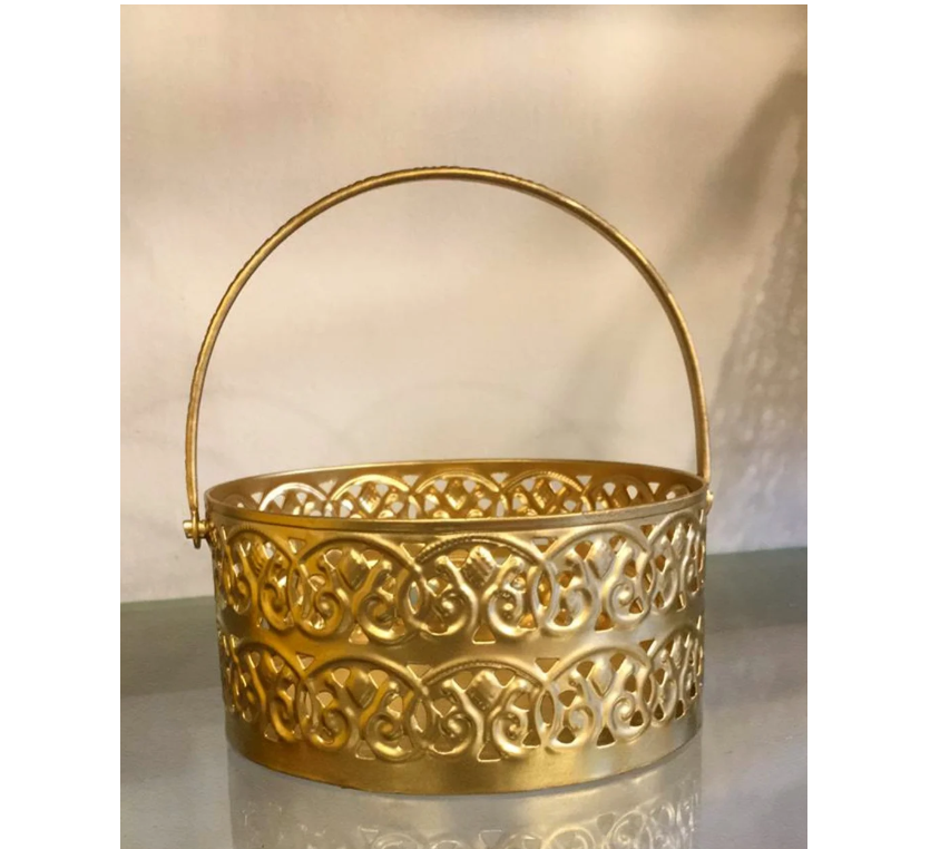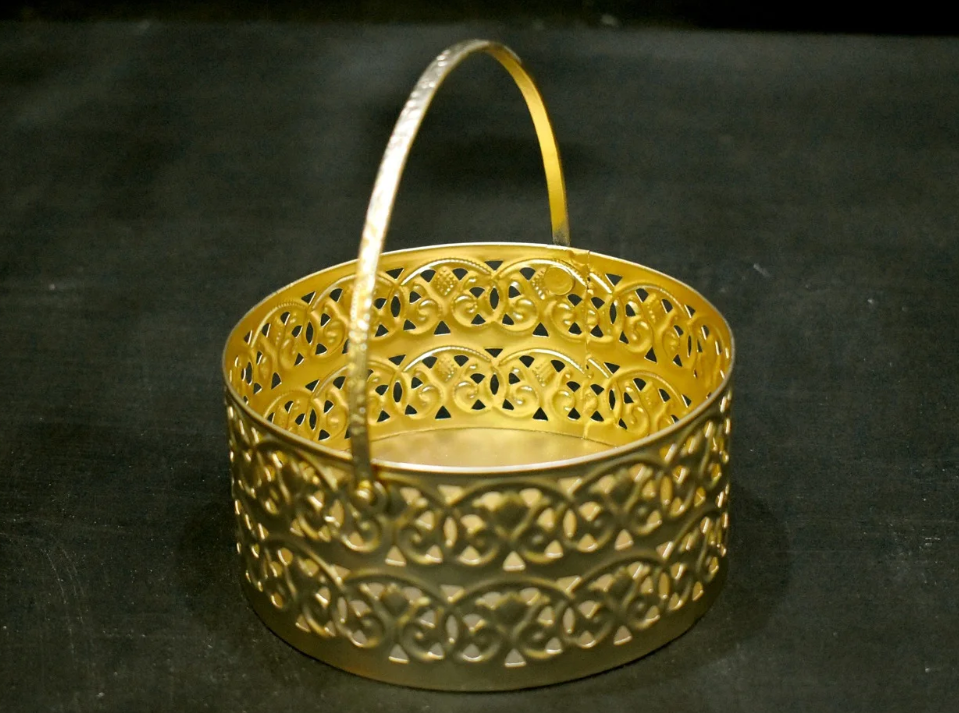 AK Brass Laser Cutting Round Metal Hamper Basket with Handle in Gold Finished For Hotel Decor / Home Decor
