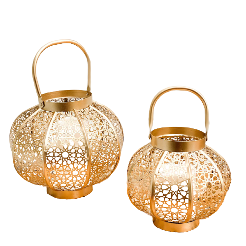 AK Brass Lattice Design Metal Moroccan Lantern With Handle In Gold Finished Set Of 2 Unique Lantern For Home Decor / Hotel Decor