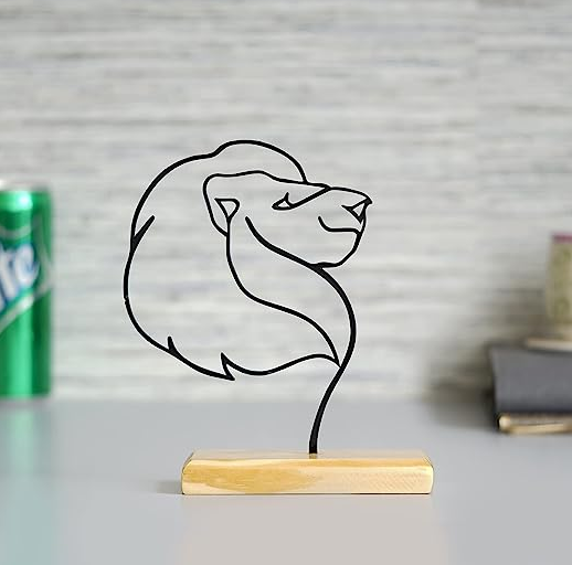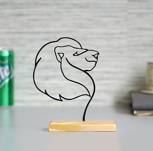 AK Brass Metal Lion Face Tabletop On Wooden Base Wire Art Design Decorative Ornaments For Table Decor And Home Decor