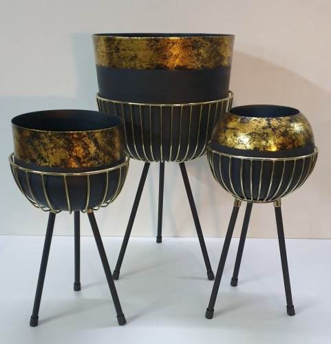 AK Brass Modern Decorative Three Planter Set Black And Golden Antique Stripes Decorative Indoor Planter Set
