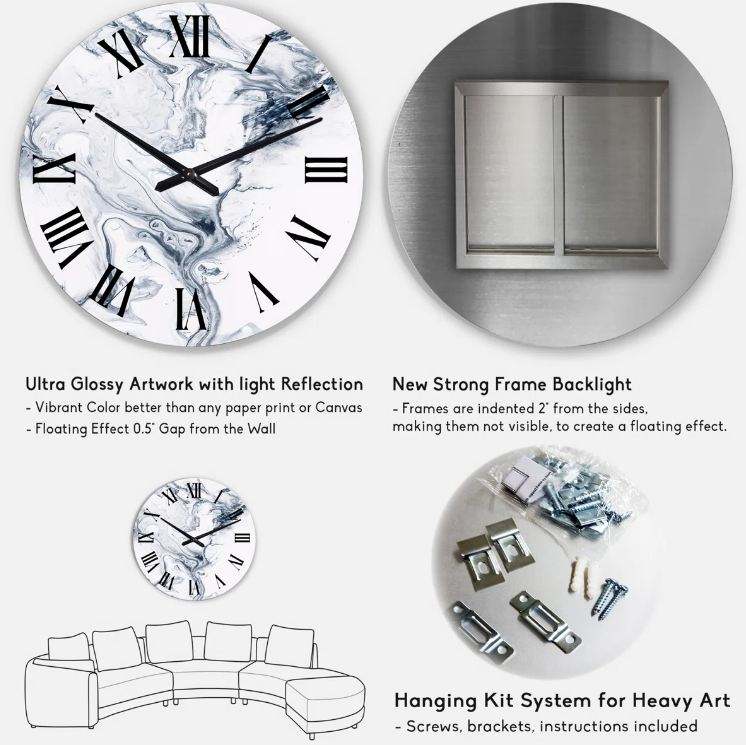 AK Brass Modern Style Metal Round Wall Clock in White & Grey Marble Finished For Hotel Decor / Living Room Decor