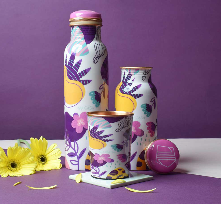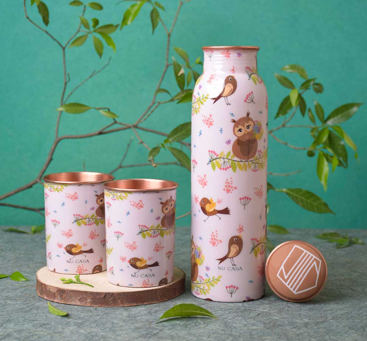 AK Brass Owl Printed Copper Water Bottle with 2 Glass in Multi Color Set of 3 at Best Price For Gym Use / Office Use
