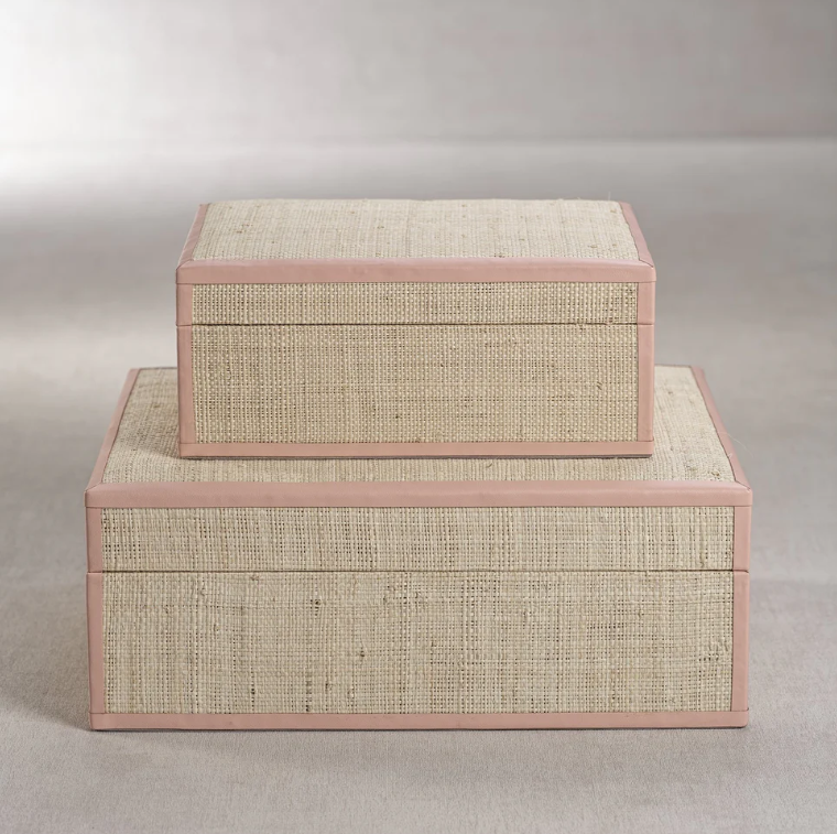 AK Brass Wooden Grasscloth Storage box in Ash Wood Color with Pink Leather Trim Set of 2 For Shelf Decor / Table Interior Decor