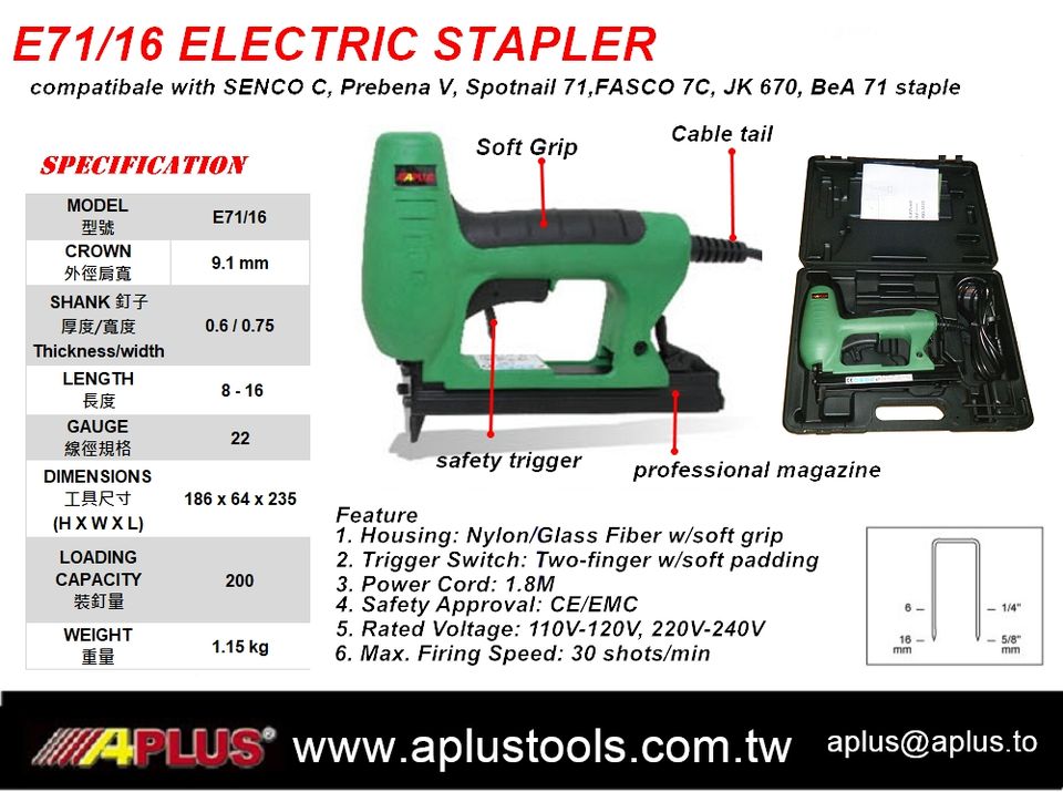 APLUS E71/16 Electric Staple Gun 9.1mm Crown Length 8-16mm 71 Staple Safety Yoke 1-Year Warranty
