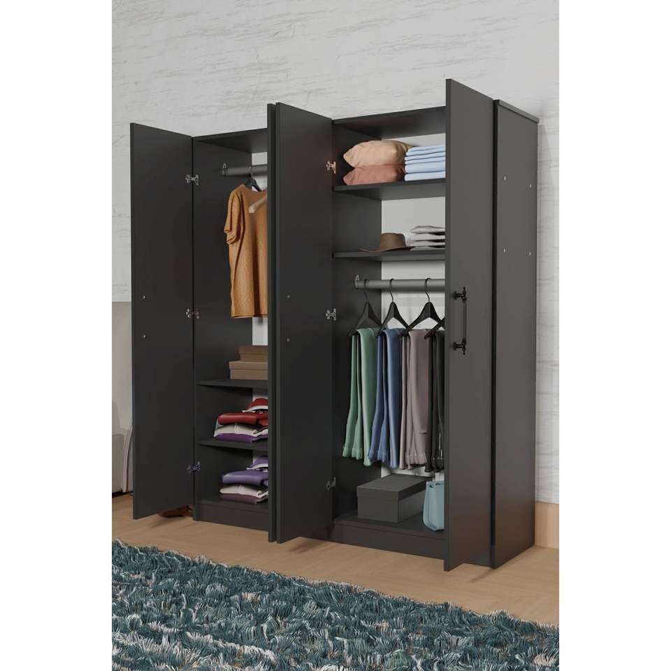 ARENA Anthracite Gray 4-Door Freestanding Closet Bedroom Storage Wooden Wardrobe with 6 Shelves and 2 Hangers Made in Turkey
