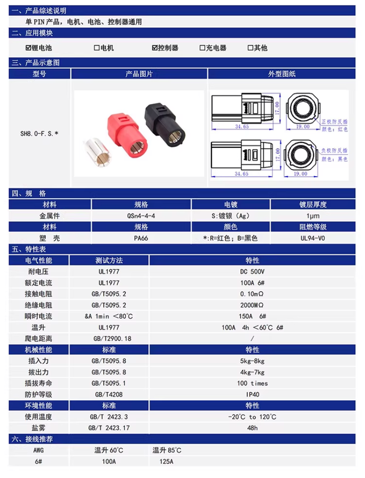 AS250-F/M Series Brass Polarized (Anti-Reverse) Male Female Connector 100A High Power SH8.0mm Plug Power Entry Module for Drone