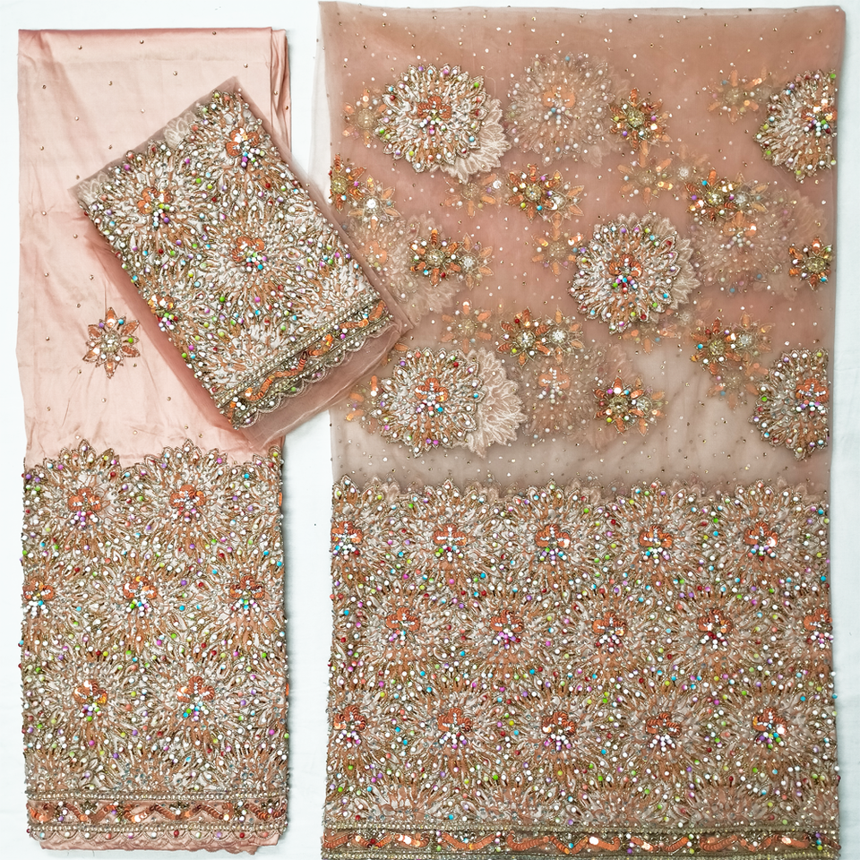 ASOEBI Women's Handmade African Style Dress Rustic Peach George Fabric with Raw Silk Bling Pearl Beads & Stone for Adults