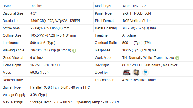 AT043TN24 V.7 AT043TN25V.2 Innolux 4.3 Inch 480*272 WLED 4-wire Resistive Touch TFT LCD Touch Screen for Automotive Portable Use