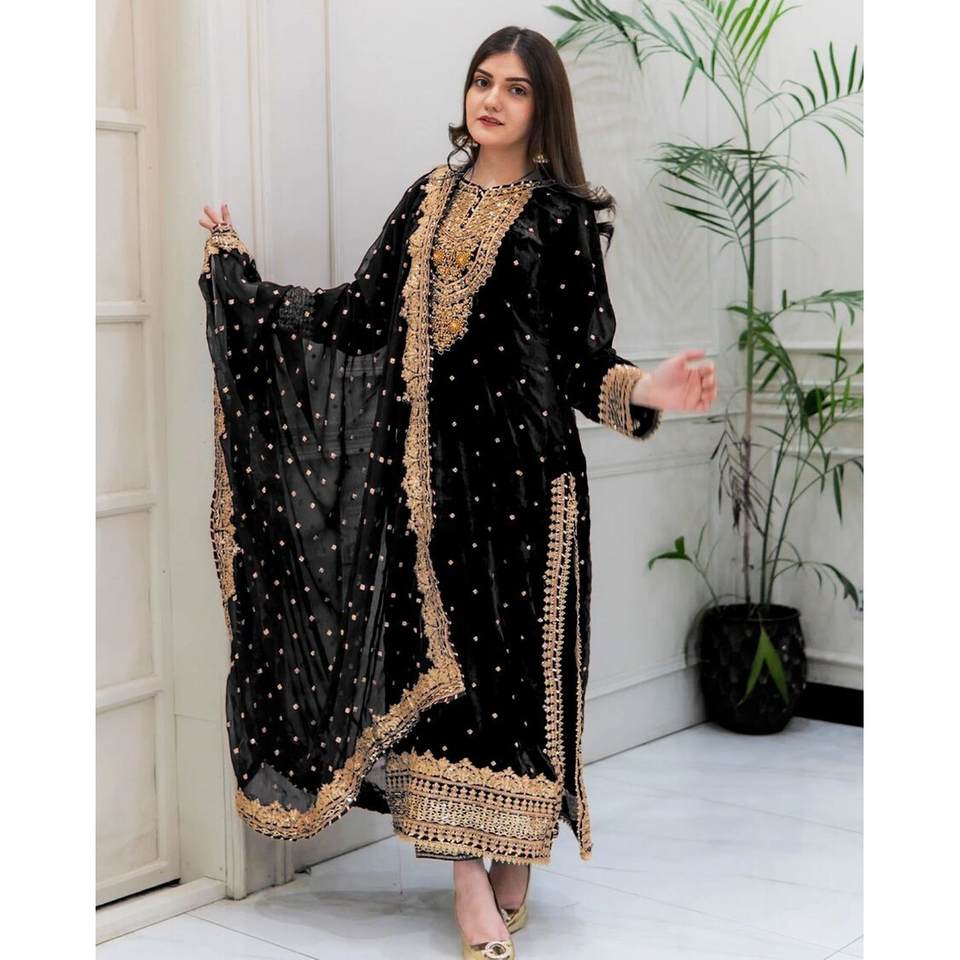 ATTRACTION COTTON VELVET EMBROIDERY SEQUENCE MOTI WORK TOP BOTTOM DUPATTA WINTER 2-Piece SET SOLID LACE LONG BUTTON BLACK