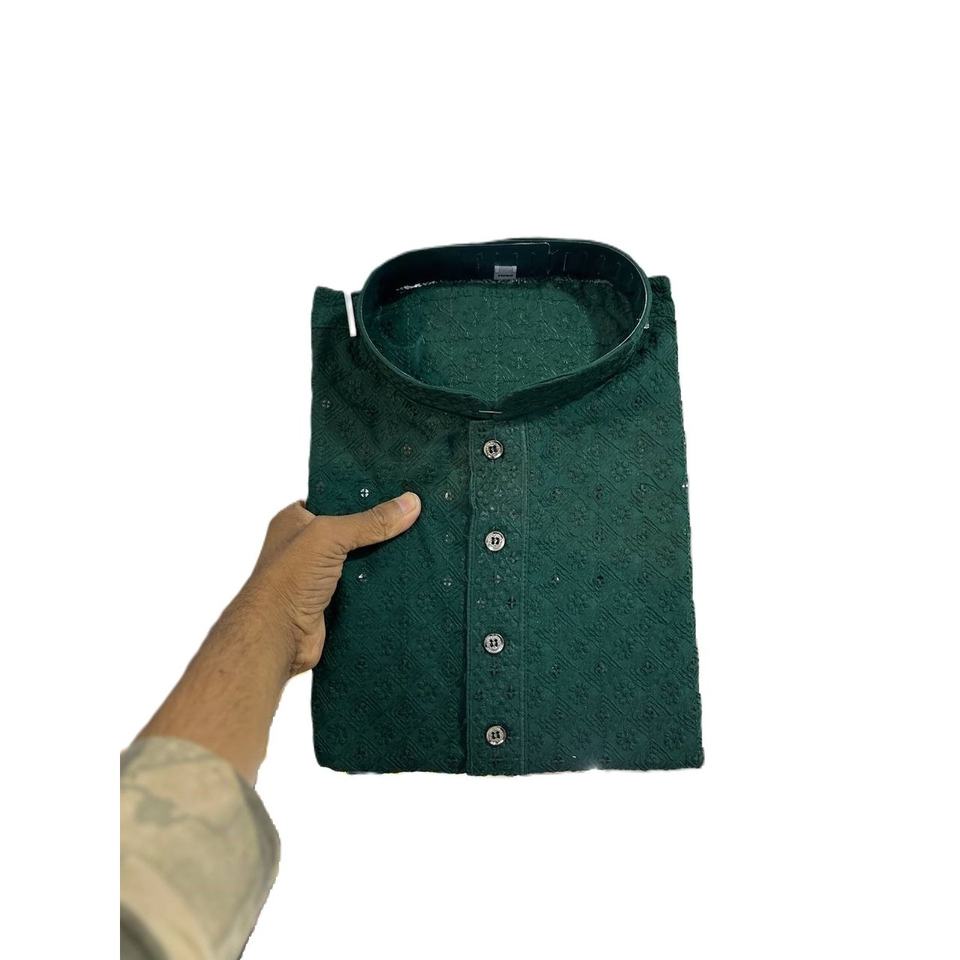 ATTRACTIVE COTTON EMBROIDERY WORK MENS KURTA PAJAMA GREEN