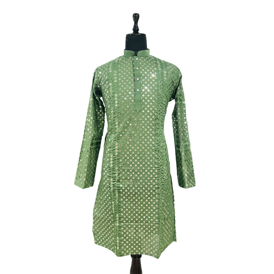 ATTRACTIVE COTTON SEQUENCE WORK MENS KURTA WITH PAJAMA PERROT GREEN Achkan Bandhgala Sherwani