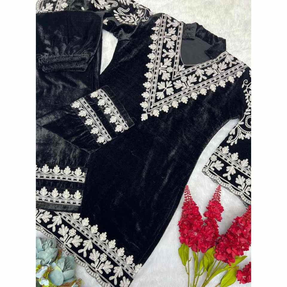 ATTRACTIVE VISCOSE VELVET EMBROIDERY THREAD WORK TOP BOTTOM BLACK