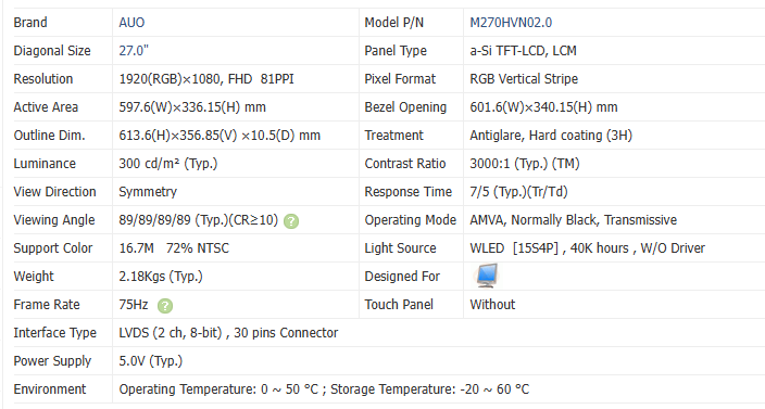 interface type:eDP (2 Lanes) , eDP1.2 , HBR1 (2.7G/lane) , 30 pins C