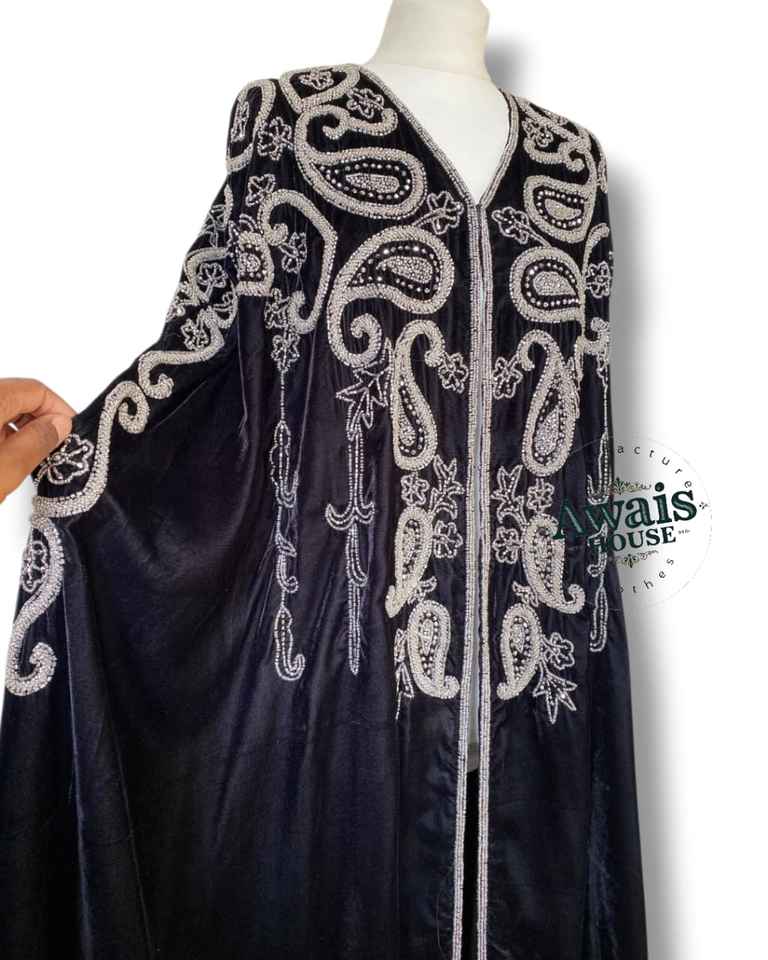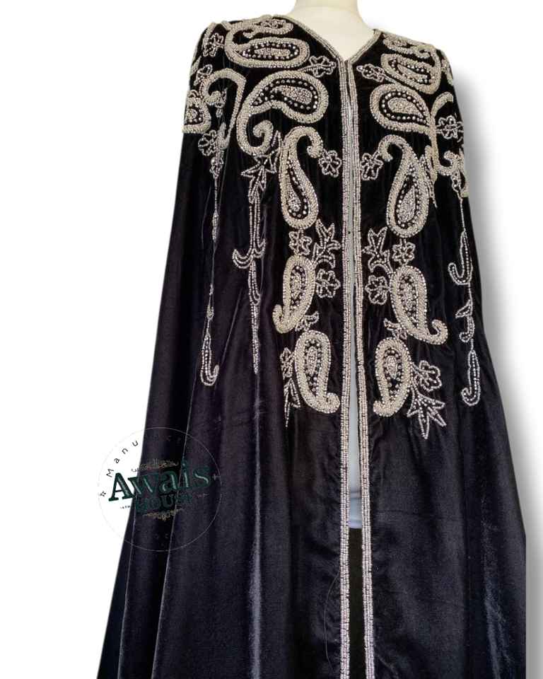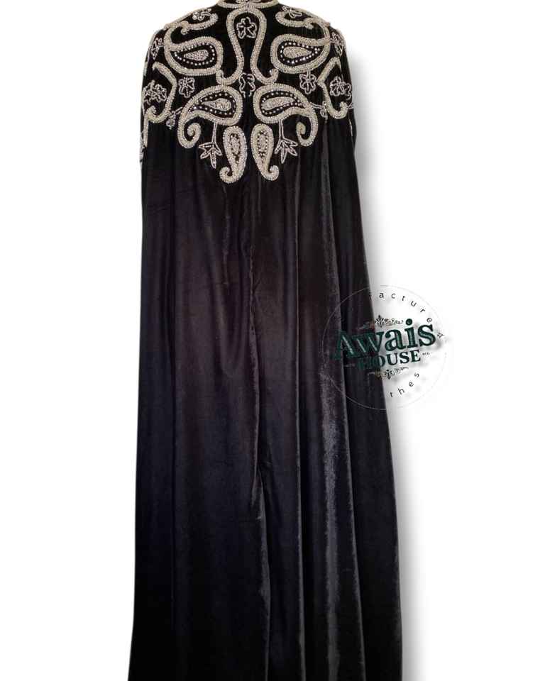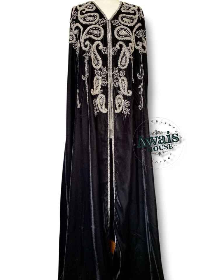 AWAIS HOUSE 2-Piece Muslim Women Modest Solid Velvet Eco-Friendly Long Sleeve Crystal Beaded A-Line Floor-Length Evening/ Dress