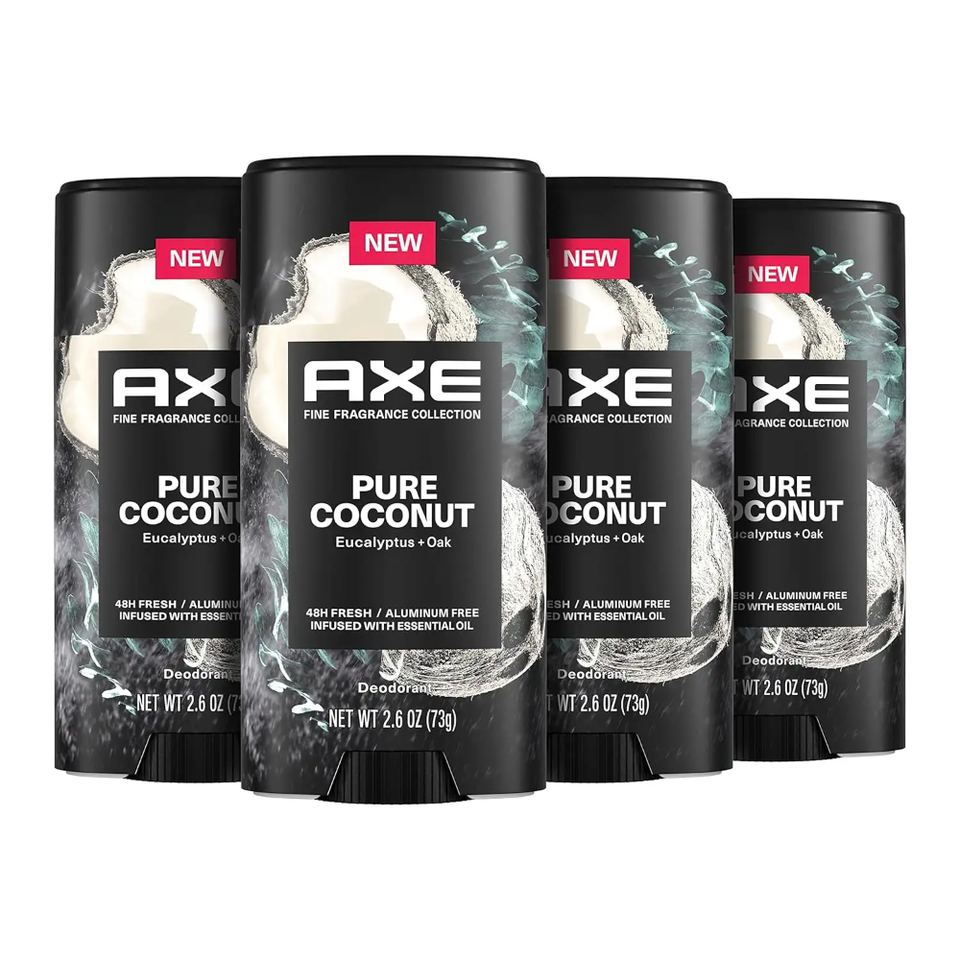 AXE Fine Fragrance Collection Deodorant Stick Pure Coconut 4 count with 48H with Coconut, Eucalyptus, and Oak Essential 2.6 oz