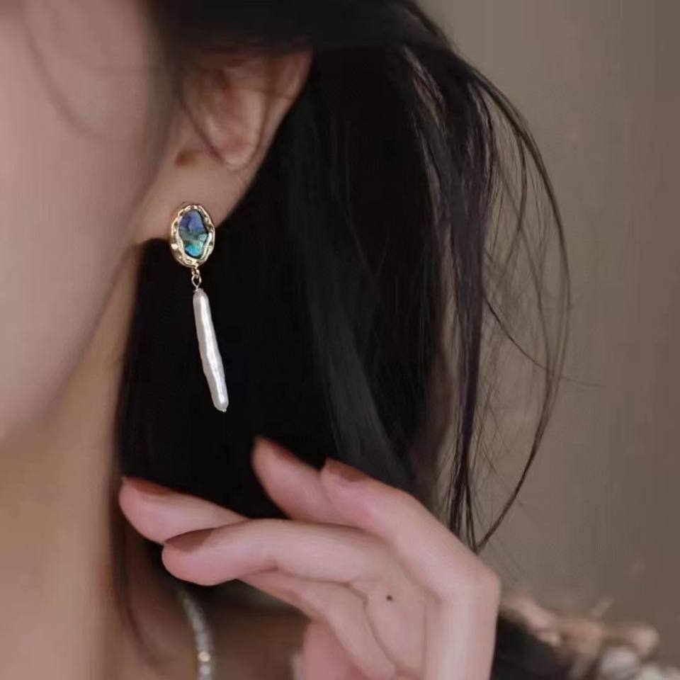 Abalone Shell Freshwater Pearl Dangle Earrings Rectangular Long S925 Pure Silver Needle Small Silver Bar Fashionable Accessories