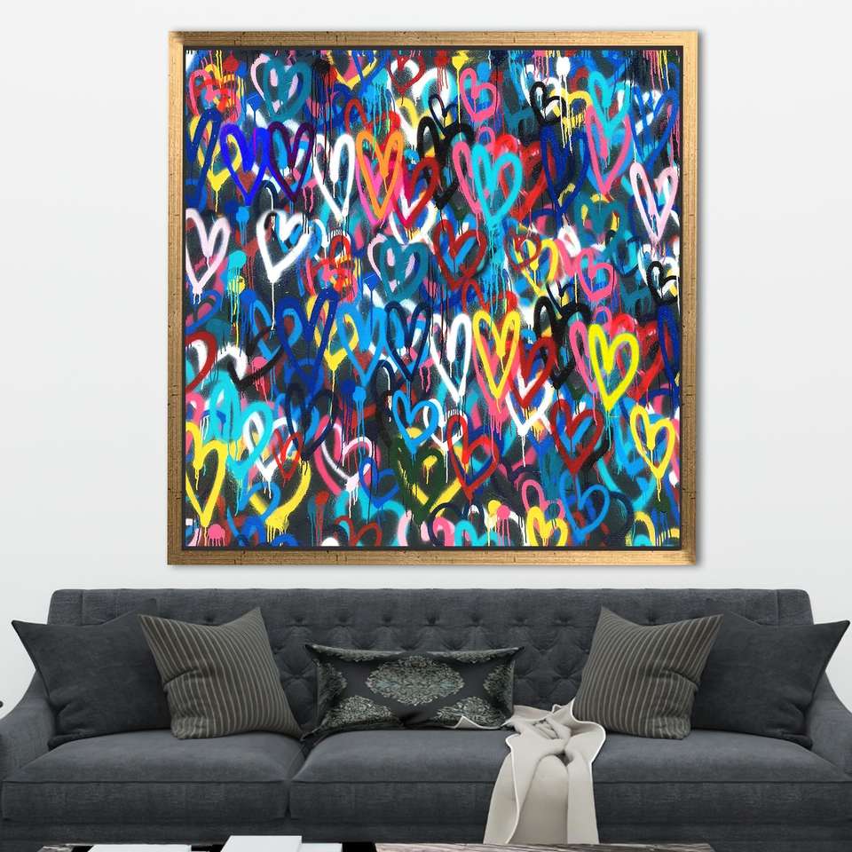 Abstract Banksy Colorful Hearts Printed Canvas - Modern Artwork,Gold Framed
