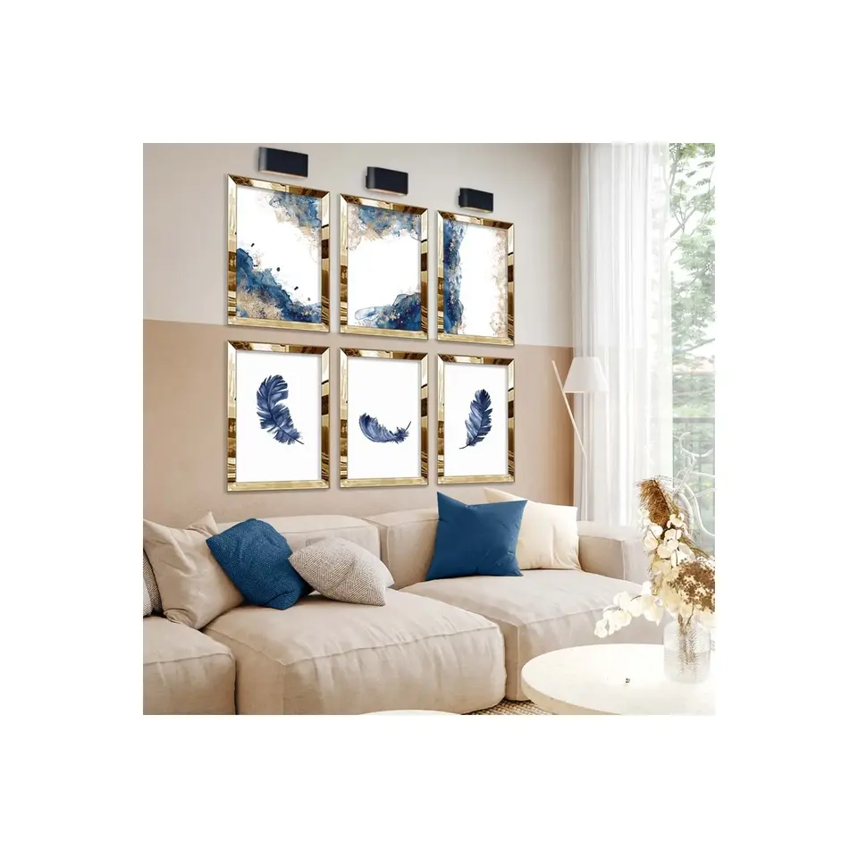 Abstract Blue Feather Theme MDF 6-Piece Set Gold Frame Plexiglass Edge Wall Art with Fadeless Feature Featureless Wall Art
