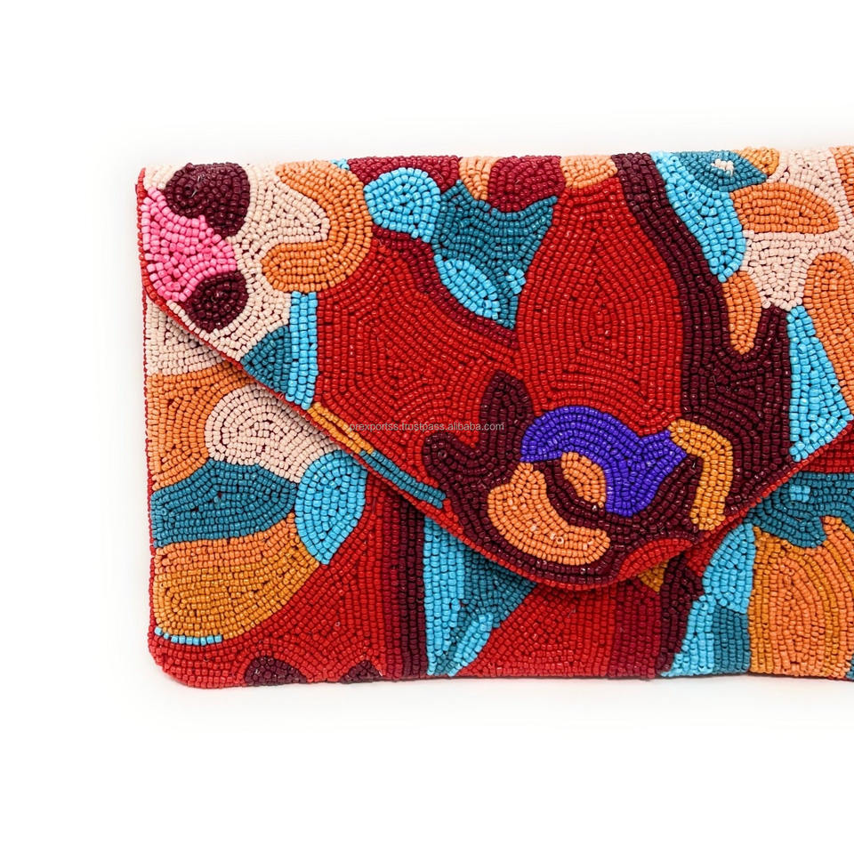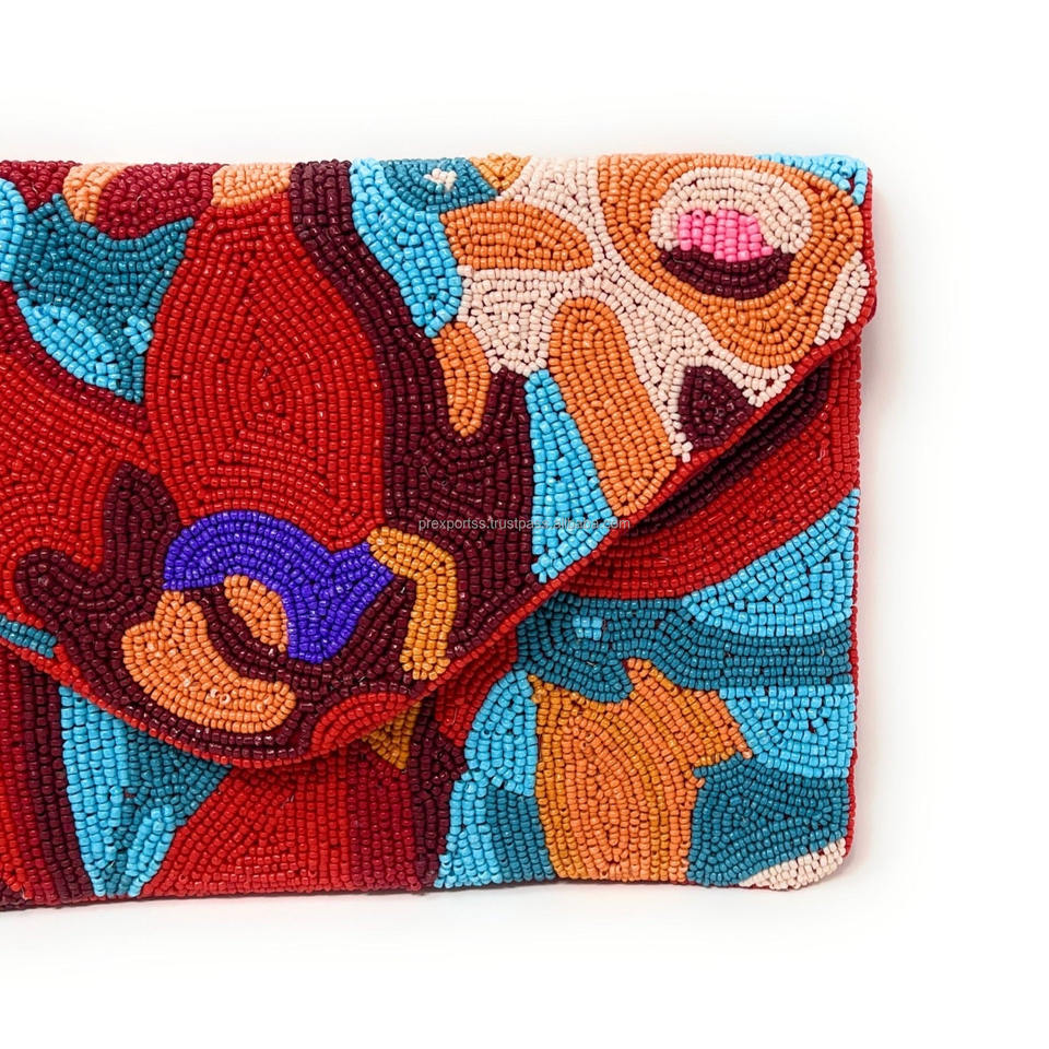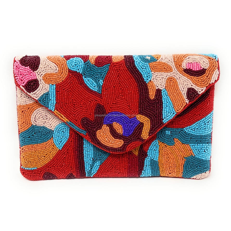 Artistic Boho Handmade Embroidered Multicolor Seed Bead Envelope Clutch Abstract Floral Beaded Casual Handbag Valentine's Day