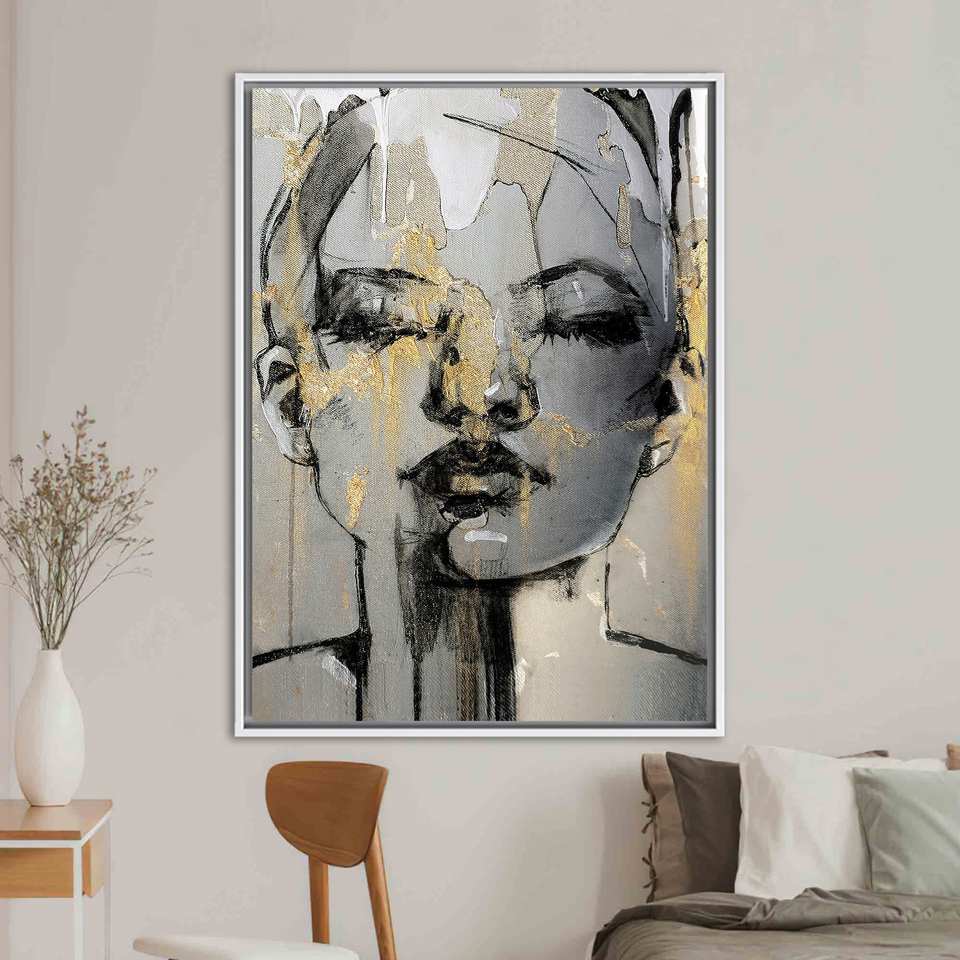 Abstract Woman Face Print Canvas Art, Modern Portrait Decor,White Framed