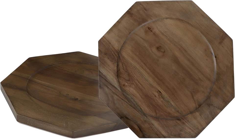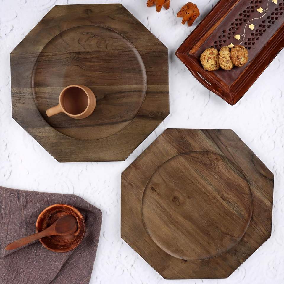 Acacia Wood Plates Set of 2 Round Wooden Dinner Plates Charger Serving Tray Lightweight Unbreakable Natural Dinnerware Dishes