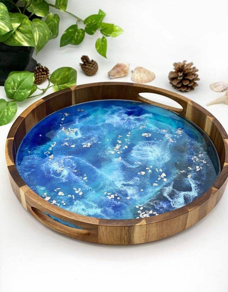 Acacia Wood Resin Serving Tray Round Ocean Epoxy Platter With Handles For Coffee Table Kitchen Food Drink Home Organizer Boards