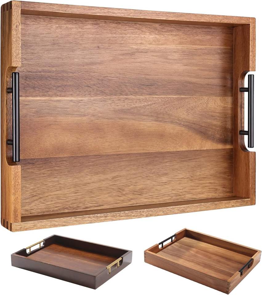 Luxury Rustic Acacia Wood Rectangle Serving Tray with Bamboo Handles Home Kitchen Counter Coffee Table Bedroom Decorative Tray