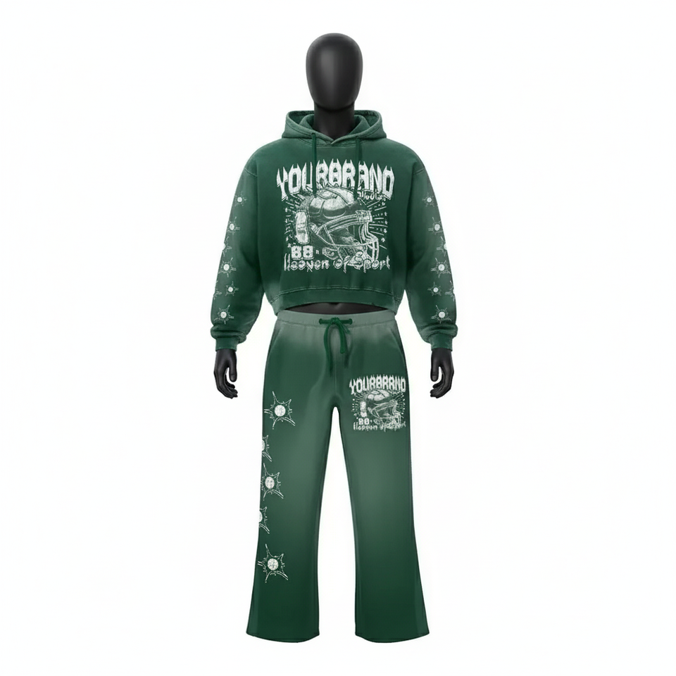 Acid Wash Raw Hem Cropped Hoodie & Flared Sweatpants Set 100% Cotton Heavyweight Custom Graphic Tracksuit Streetwear Fashion