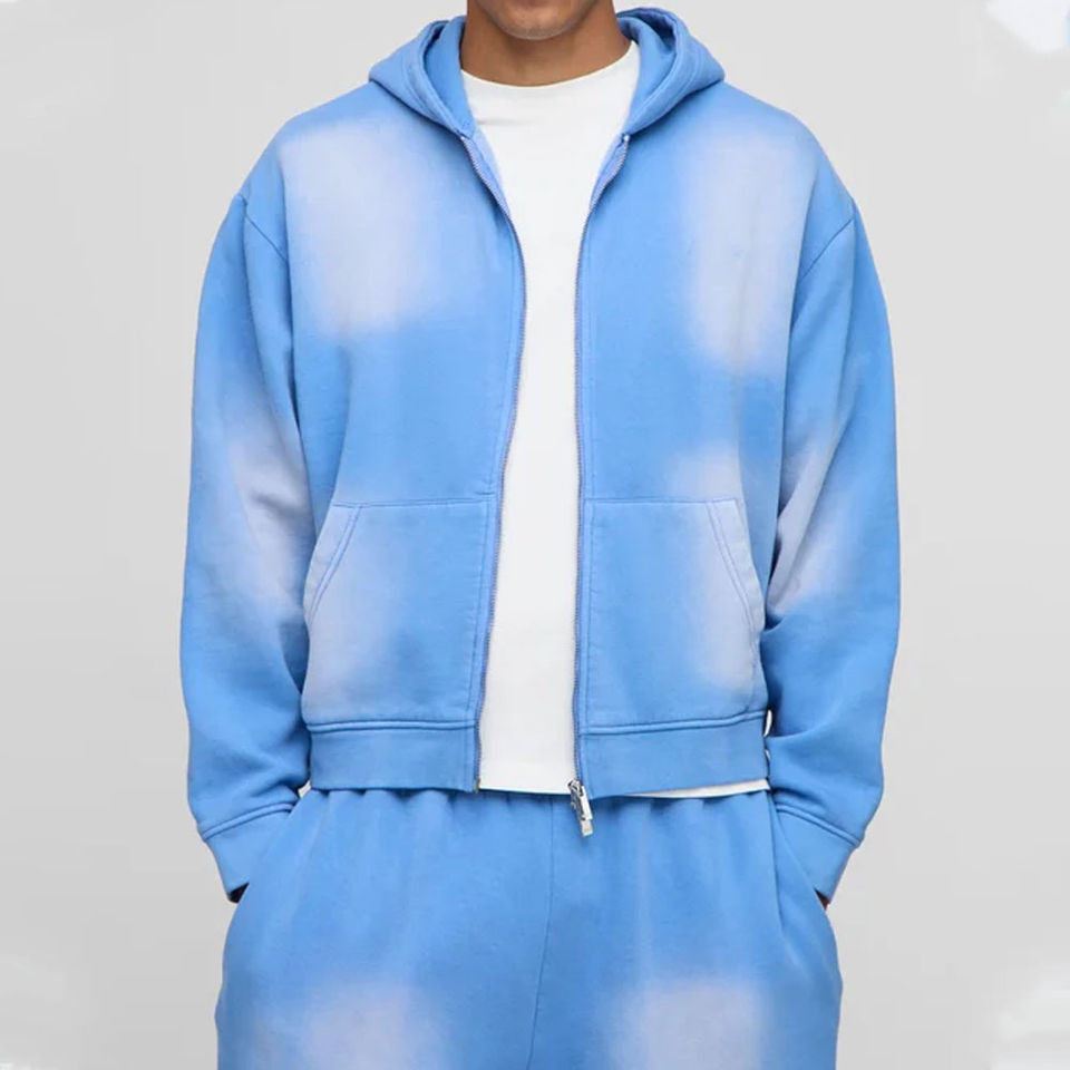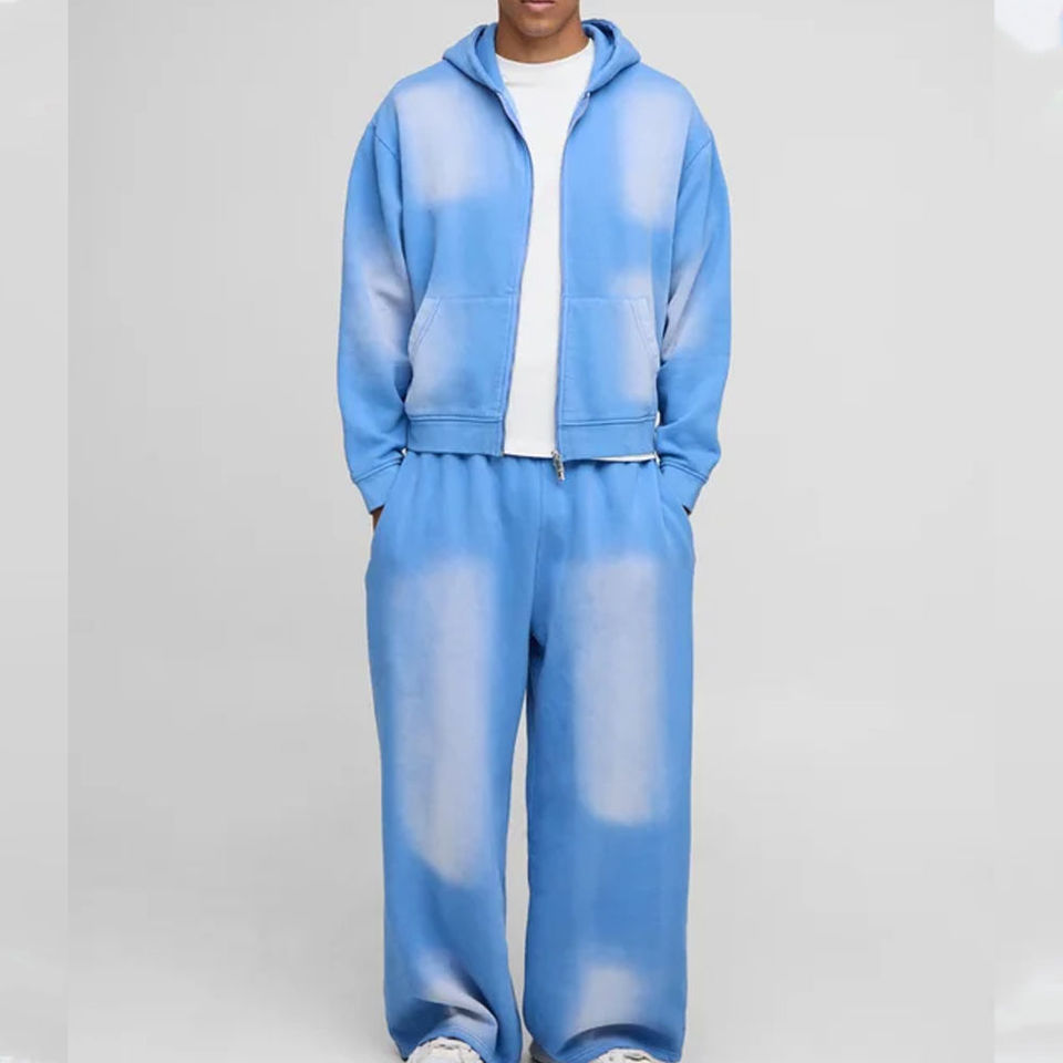 Acid Wash Sweat Suits Cotton Thick Zip up Applique Embroidery Patch Flared Full Tracksuits Hoodies and Sweatpants Sets for Men