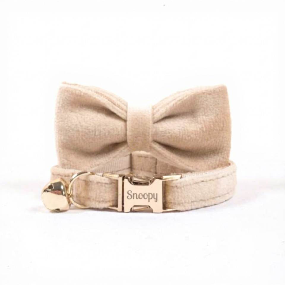Adjustable Beige Bow Name Buckle Soft Velvet Bell with Gold Bell Custom Tactical Solid Fiber Cat Collar for Gift