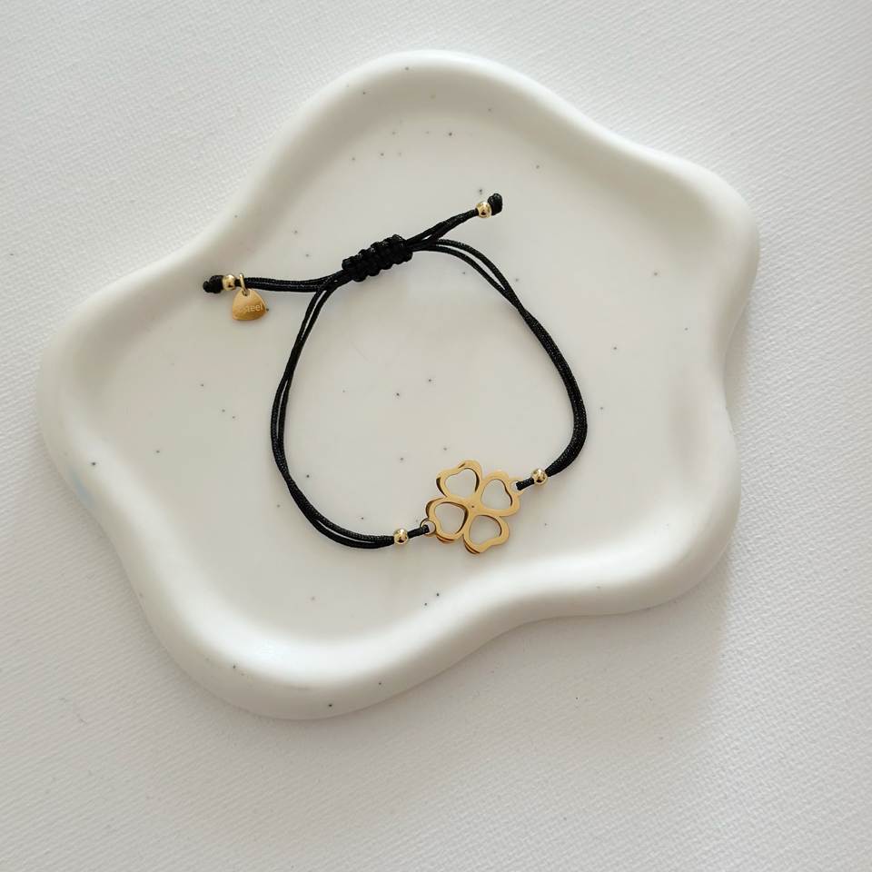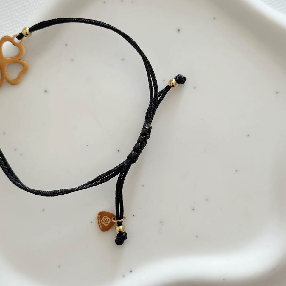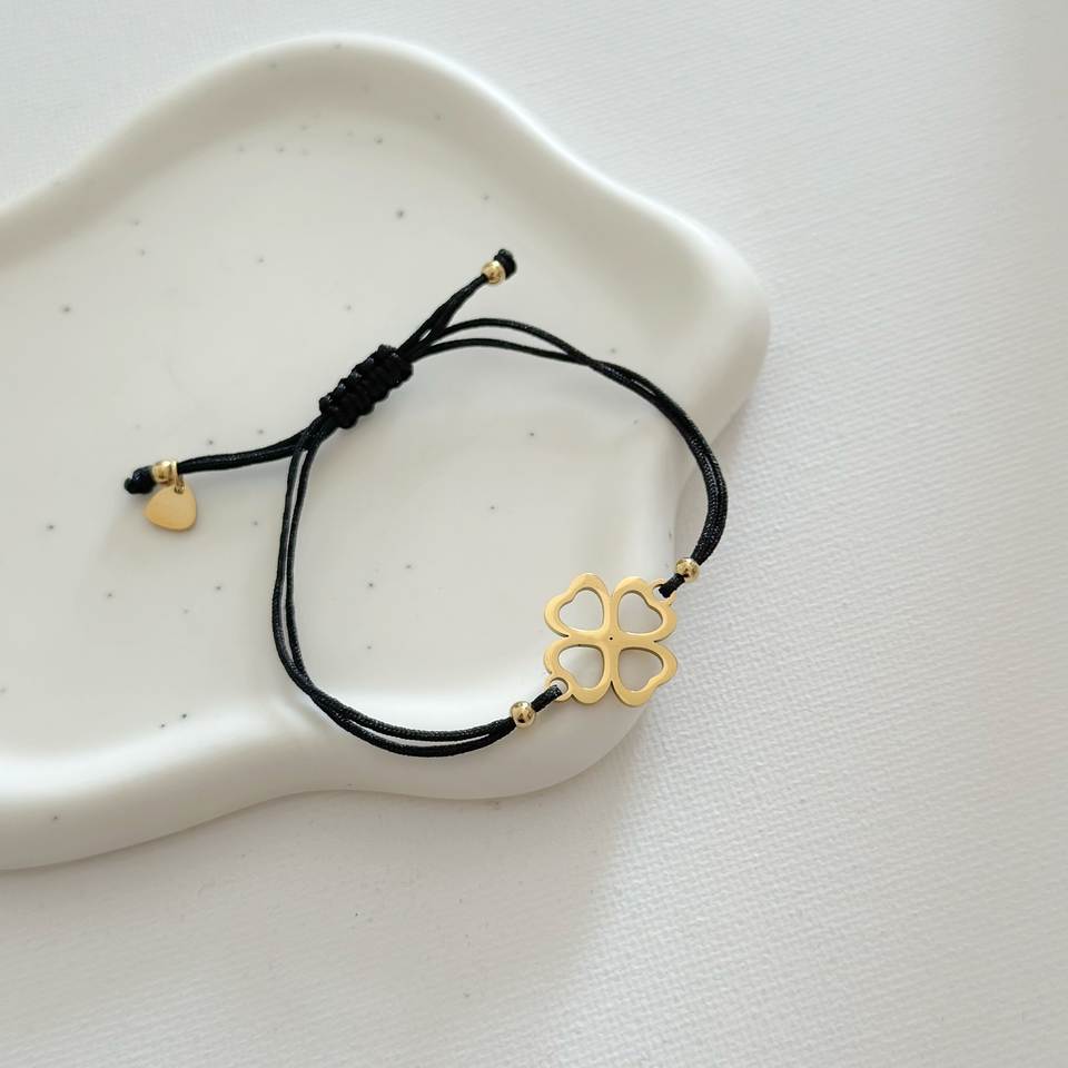 Adjustable Bohemian Black Cord Bracelet with Four-Leaf Clover Charm Beaded Stainless Steel Jewelry featuring Pearl Main Stone